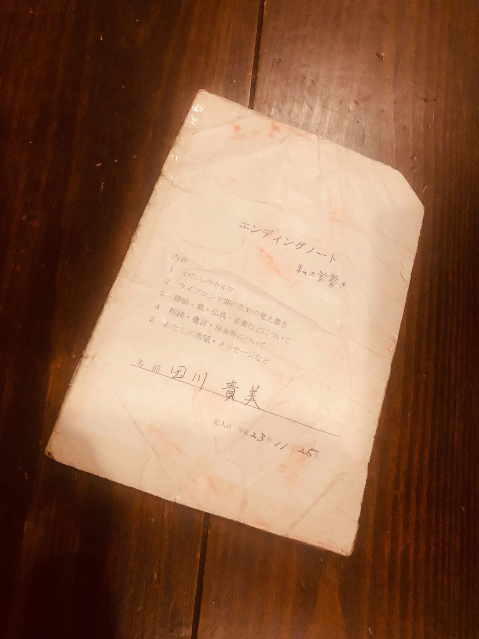 まさか、このエンディングノートが作成からわずか4年後に使うとは思っていませんでしたが、原発不明がんを宣告されたその日に、母が、「わたしのこれからはあんたと作ったノートに書いてあるから、この通りにしてね」と私に手渡してくれました。
