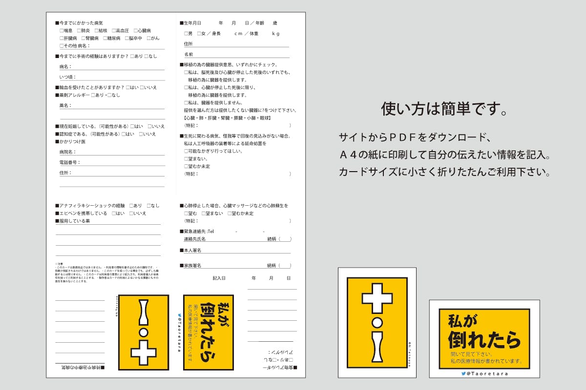 あなたや家族がもしも一人で出かけた先で倒れた時、周りの人はあなたの事を知りません。持病やアレルギーで倒れたとしてもそれを誰も知りません。そんな時にこのカードを持っていればあなたや家族が何故倒れたか推測でき、すぐに対応することが出来るかもしれません。逆に目の前で知らない人が倒れた時、その人がこのカードを持っていれば、その人を知らなくても直ぐに対処できるかもしれません。この一枚が命を守る事になるかもしれない。[※1]