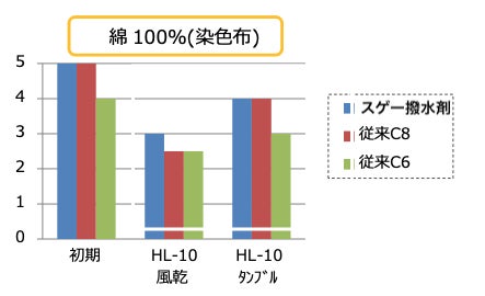 横軸にあるHL-10は家庭洗濯10回での撥水機能等級を示しています。風乾というのは自然乾燥です。タンブルは乾燥機(熱で乾かす)です。ジーンズはタンブル乾燥をNGとしています。本リターン品もNGです。