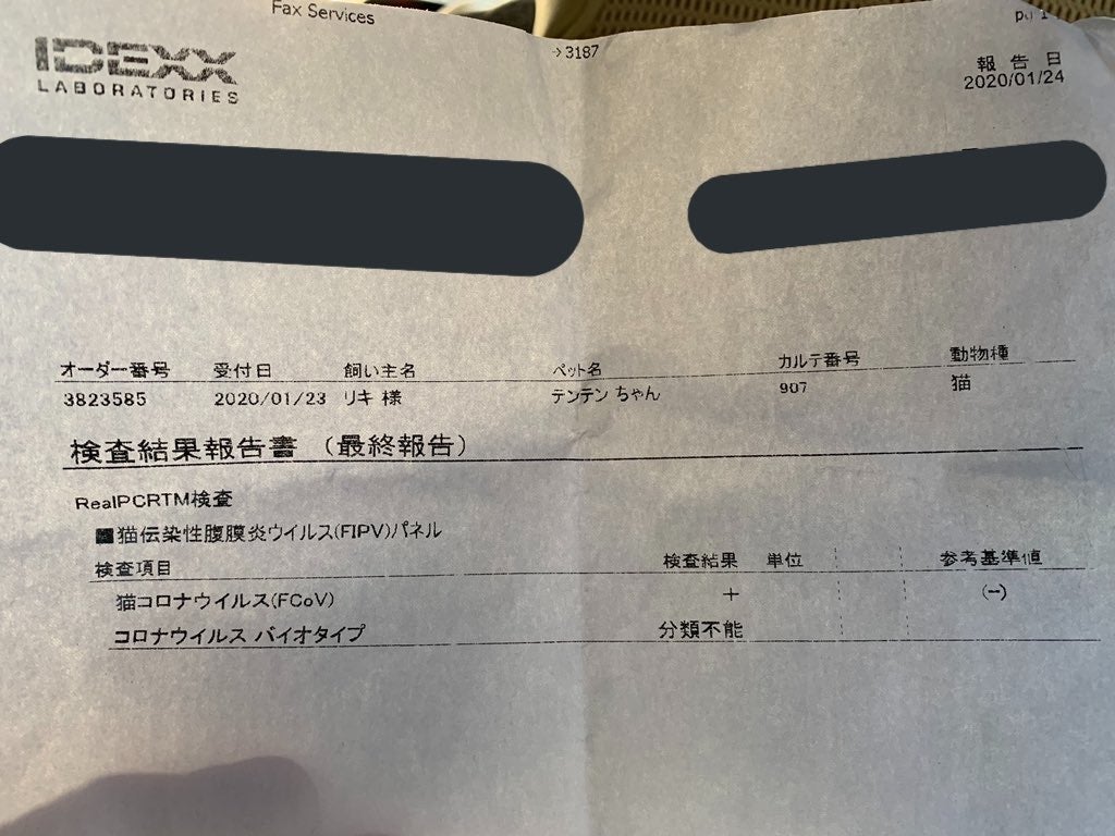 ウェットタイプの猫伝染性腹膜炎(FIP)が確定しました。
