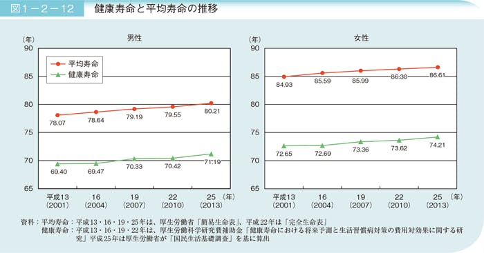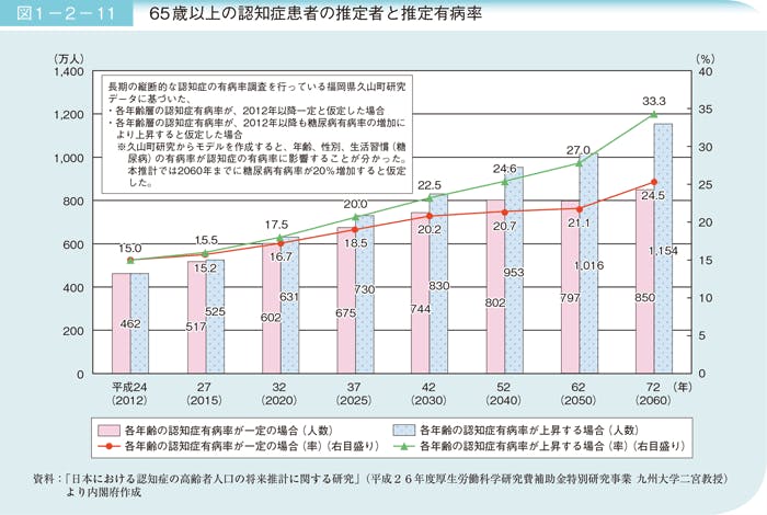内閣府の統計によると、認知症と診断される方は増えており(2015年時点で500万人超)、健康寿命と平均寿命にも差があることが分かります(2013年時点で約10年)。