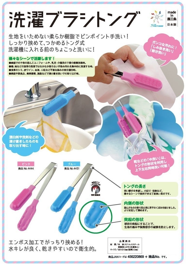 このように、『洗濯ブラシトング』は、水切れもよく、とっても衛生的で皆様のご負担を軽減するお洗濯の必須アイテムであり、心強いパートナーとなります。
