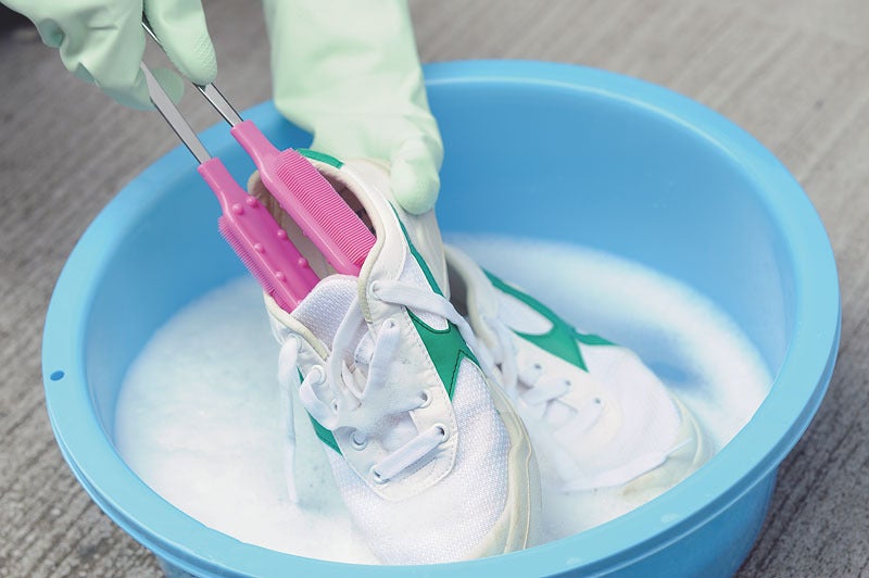 ●靴などの中洗いはトングの形状を利用し、上下左右同時洗い可能