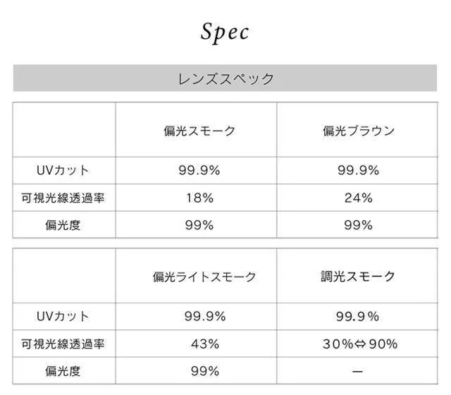 ※偏光度とは、乱反射光をカットする効果を表す指標です。この数値が高い程クリアな視界を得られます。