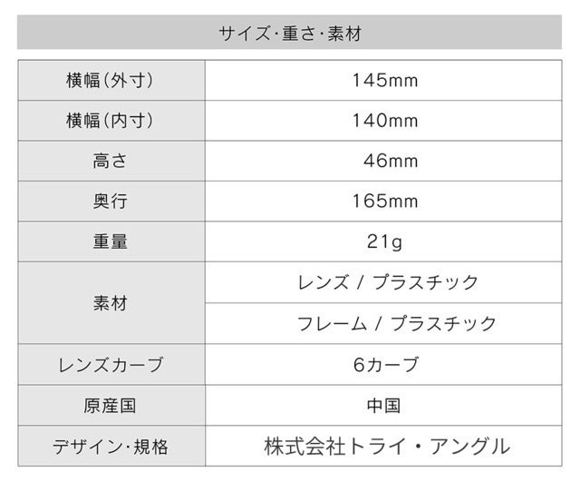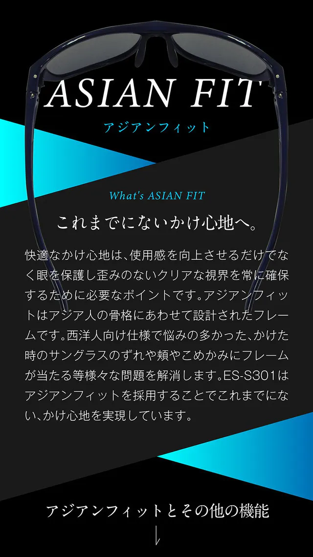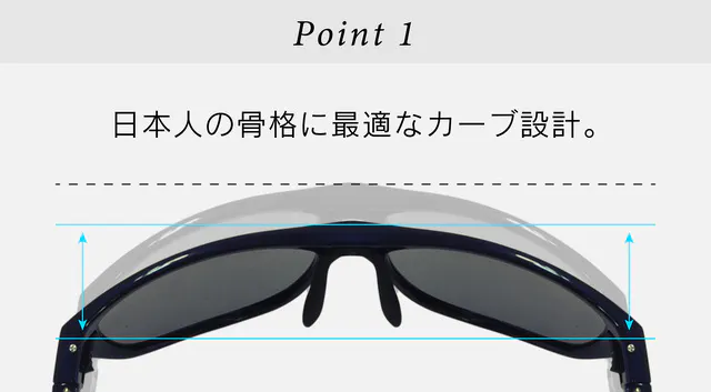 多くのサングラスは西洋人の立体的な骨格にあわせて設計されているため、日本人がかけると、レンズが頬に当たったり、締め付け感が強くズレの原因となる場合があります。ES-S301は、フレームのフロントカーブを日本人の骨格にあわせて設計することで、快適なかけ心地を実感できます。