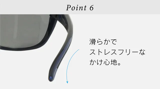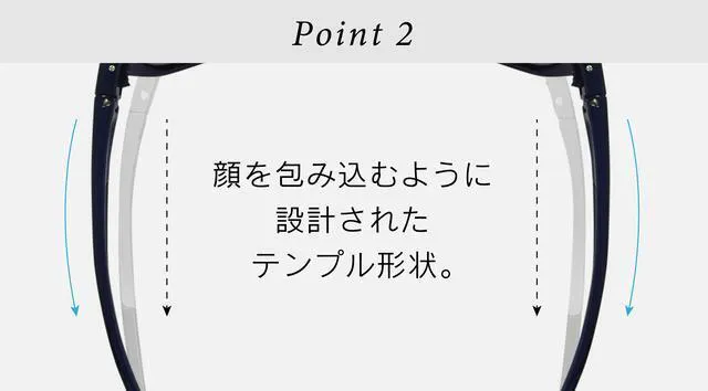 テンプルの先はスムーズにかけられるようにカーブした形状で、装着時にこめかみに引っかかるストレスを解消します。