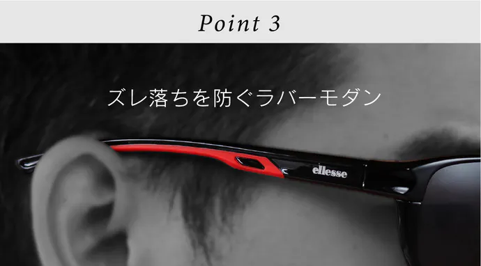 テンプルと一体型のラバーモダンが顔の側面から耳にかけてのフィット感を向上。汗などの水分を含むとグリップ力が高まり、アクティブなシーンでもズレを防止します。