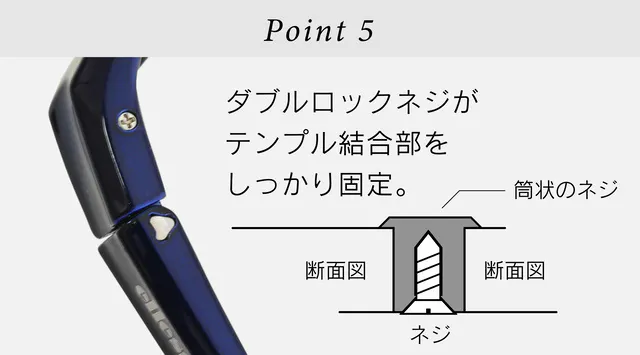 テンプルの上下から固定するダブルロックネジを採用し、ネジの緩み、テンプルのバタつきを防止します。