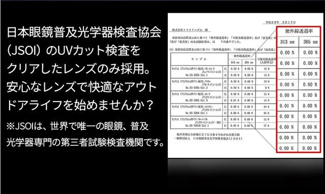 レンズは福井県鯖江市にある一般財団法人「日本眼鏡普及光学器検査協会」で検査済みの高性能UV99.9%カットレンズを採用しています。 レンズ自体にUV吸収剤が練り込まれており、 表面に傷がついてもUVカット効果が持続します。