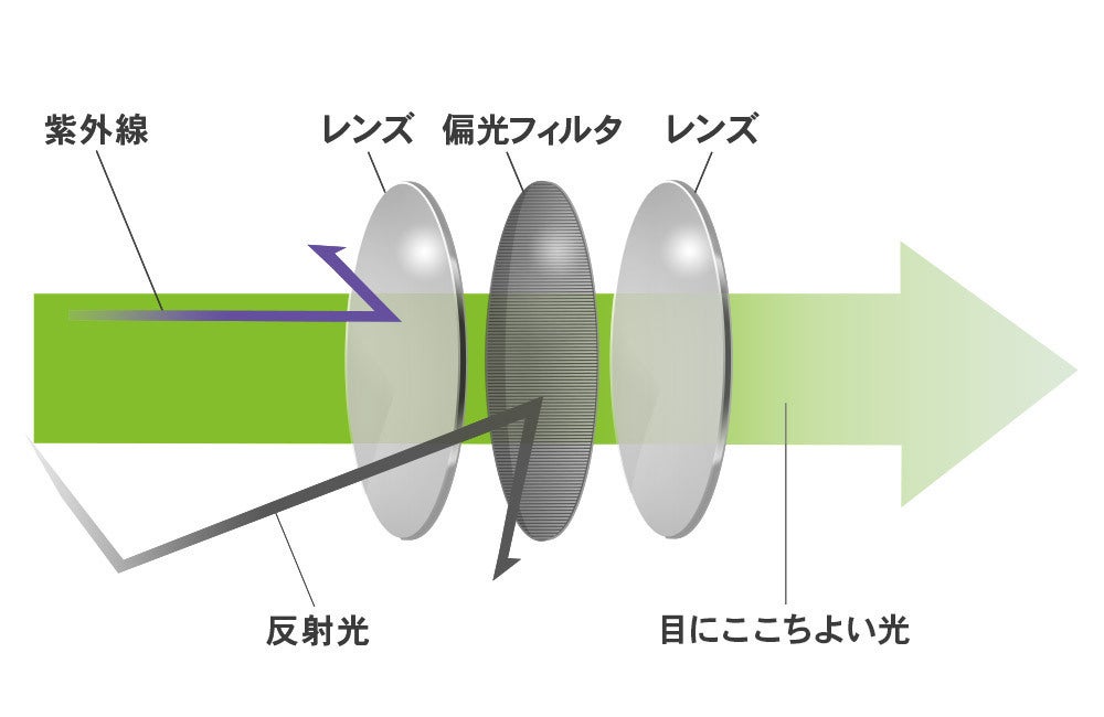 当スポーツサングラスセットは、3枚のレンズに偏光レンズを採用しています。偏光レンズはレンズとレンズの間に特殊フィルムを挟み込んだ特殊レンズで、ブラインドカーテンのような効果でまぶしい乱反射光をカット。目に心地よい光だけを透過します。