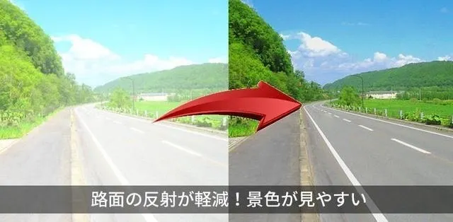 最高レベルの偏光性能で自動車のフロントガラスの反射光や、芝、水面、路面などのギラツキを除去。裸眼では見られないクリアな視界を実現します。
