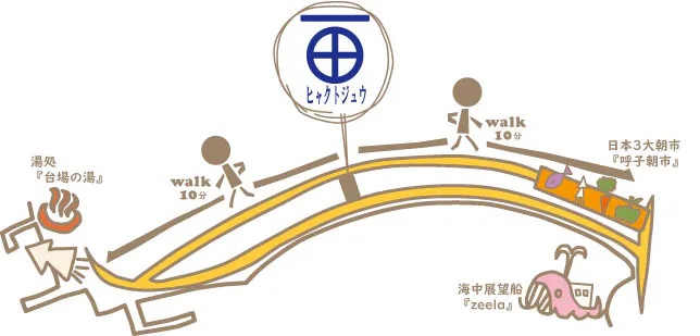 百と十は、呼子の町のちょうど真ん中にあたる便利な立地にあり、日本三大朝市の「呼子朝市」や「海中展望船ジーラ」の発着所へ約徒歩10分で到着します。