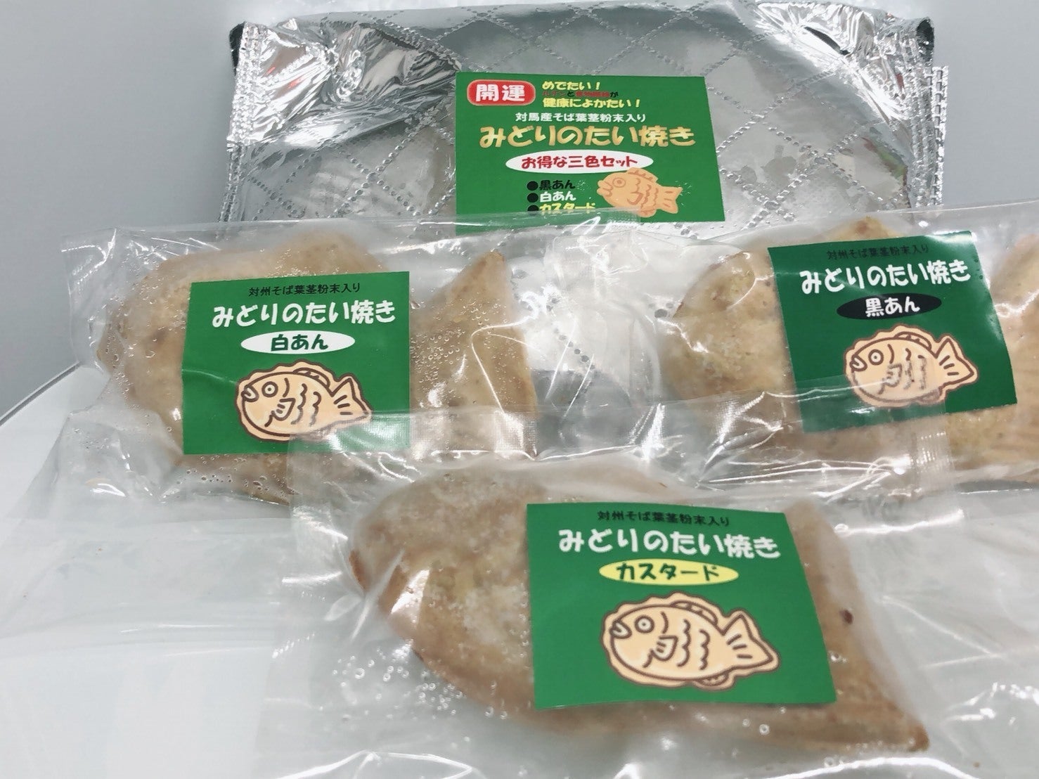 対馬産蕎麦葉茎粉末が入った「みどりのたい焼き」シリーズ