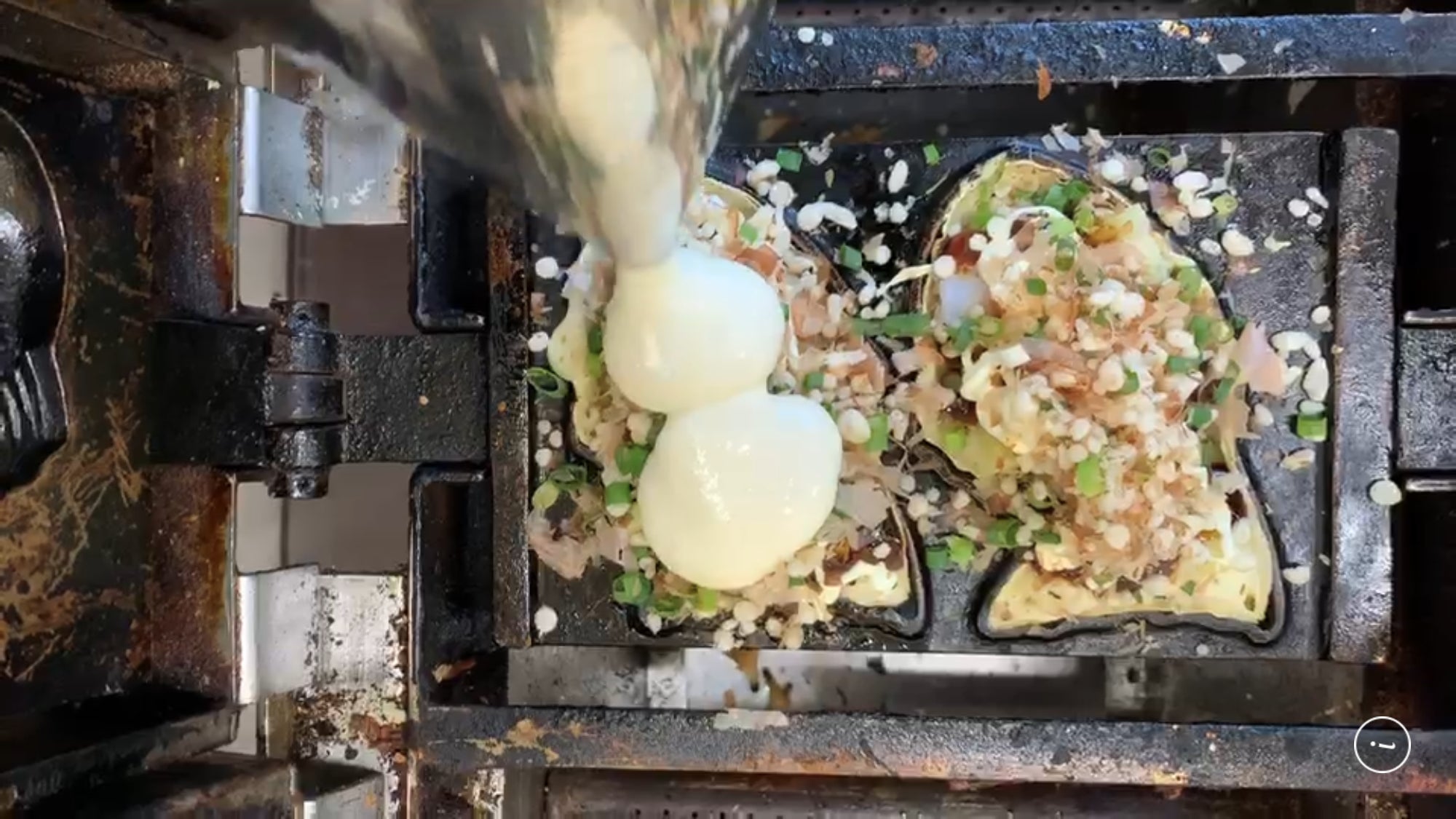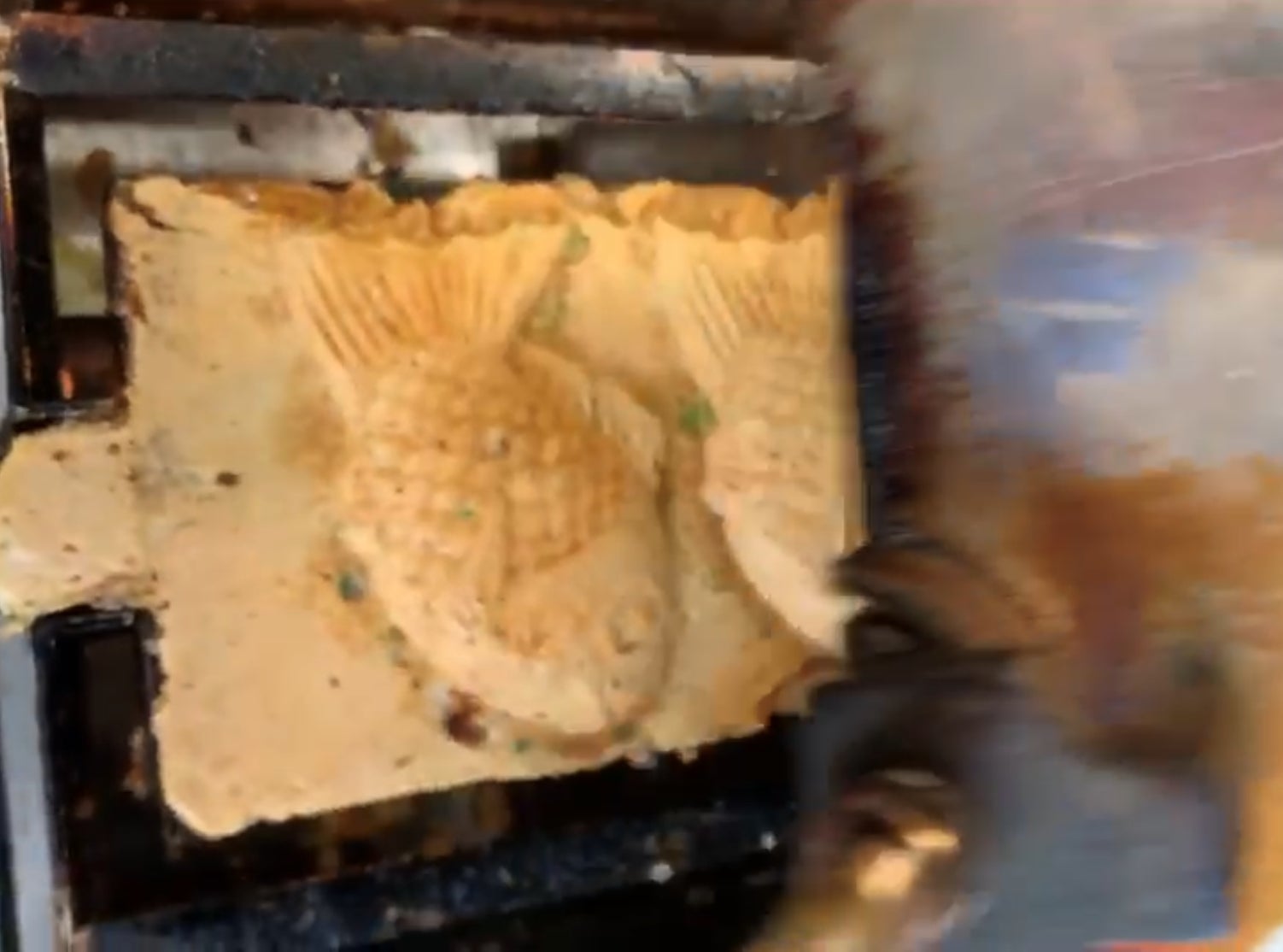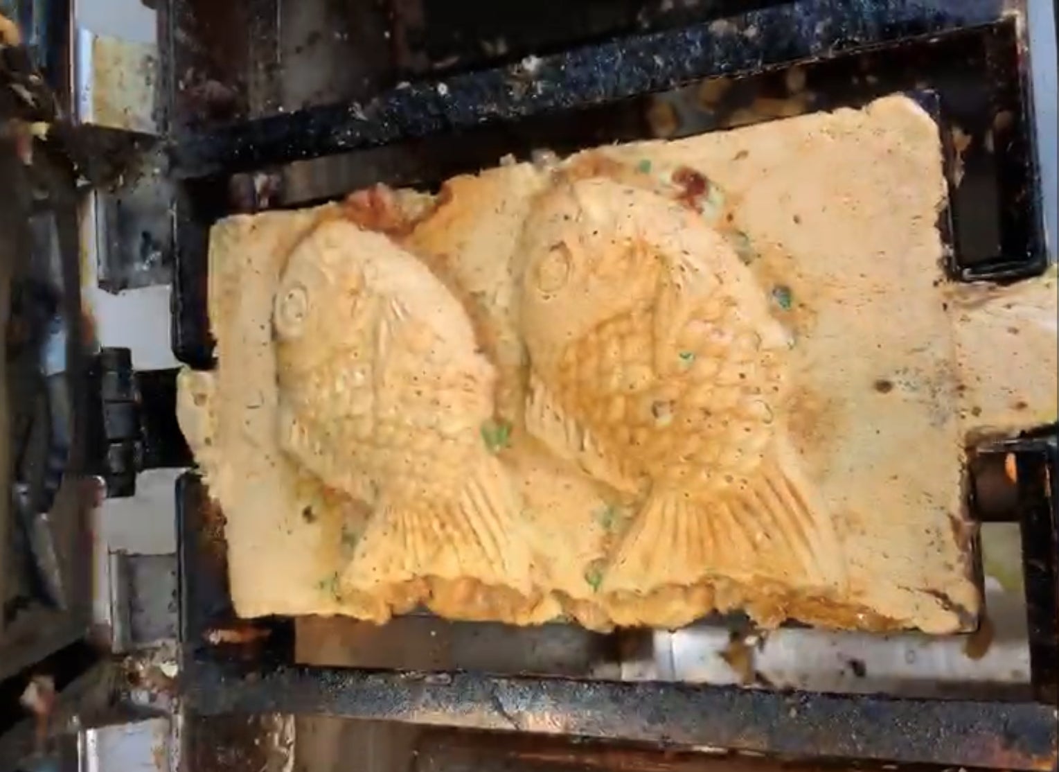 焼いてるうちに、たい焼きでも、対馬の宣伝ができないかと考え、まずはタコ焼きのタコを対馬産に変えて、次は、たい焼きの具もタコ焼き風にして焼いてみました。