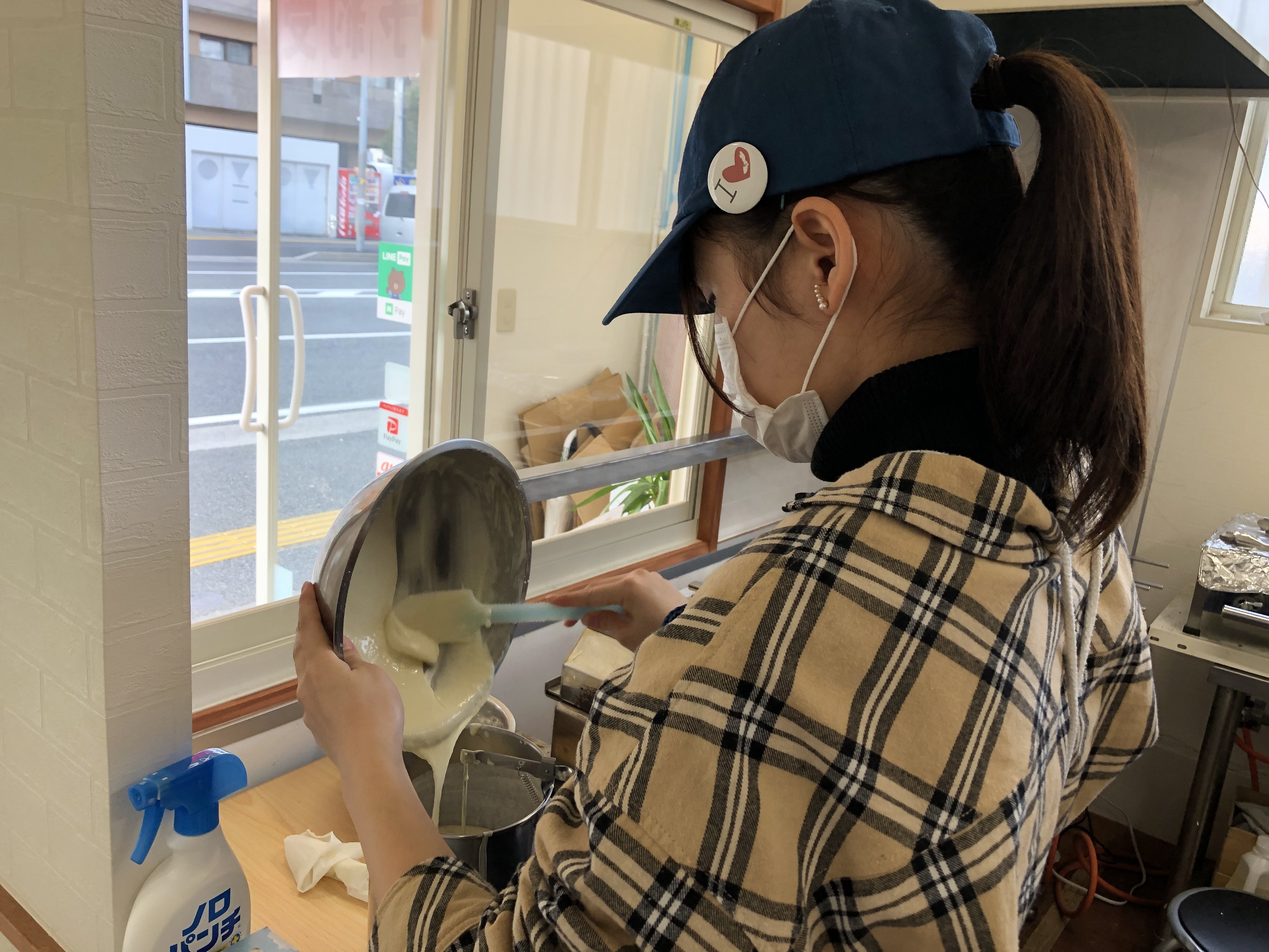 福岡市大橋駅近くにある現在の店舗は、今年の一月、冷凍製造業の許可を取るために、店舗改装し窓口だけにしました。対馬の商品を陳列するスペースはなくなり、ほぼたい焼きの工場となってしまいました。