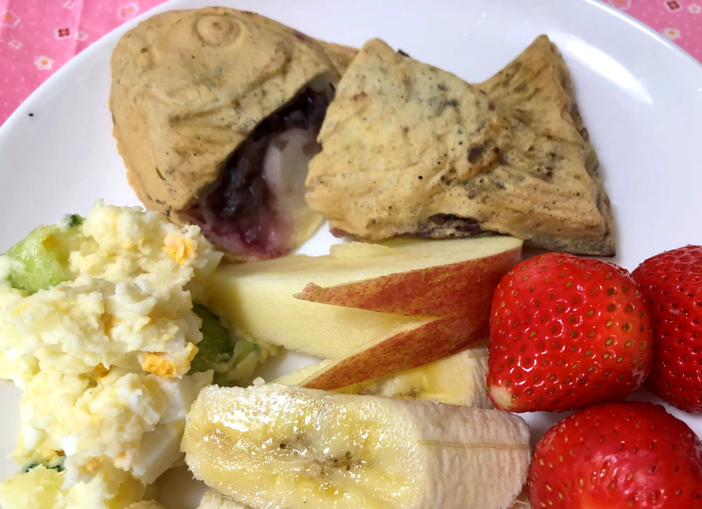 これもシンプルプレートです。白玉あんこのたい焼きは、その名の通り、黒あんに白玉が入ったたい焼きです。黒あんと抹茶アイスは、以前の組み合わせで合うことがわかっていたので使ってみました。あとは家にあったスコーンを添えて、ホイップクリームで飾り付け。シンプルですが満足感は十分でした。