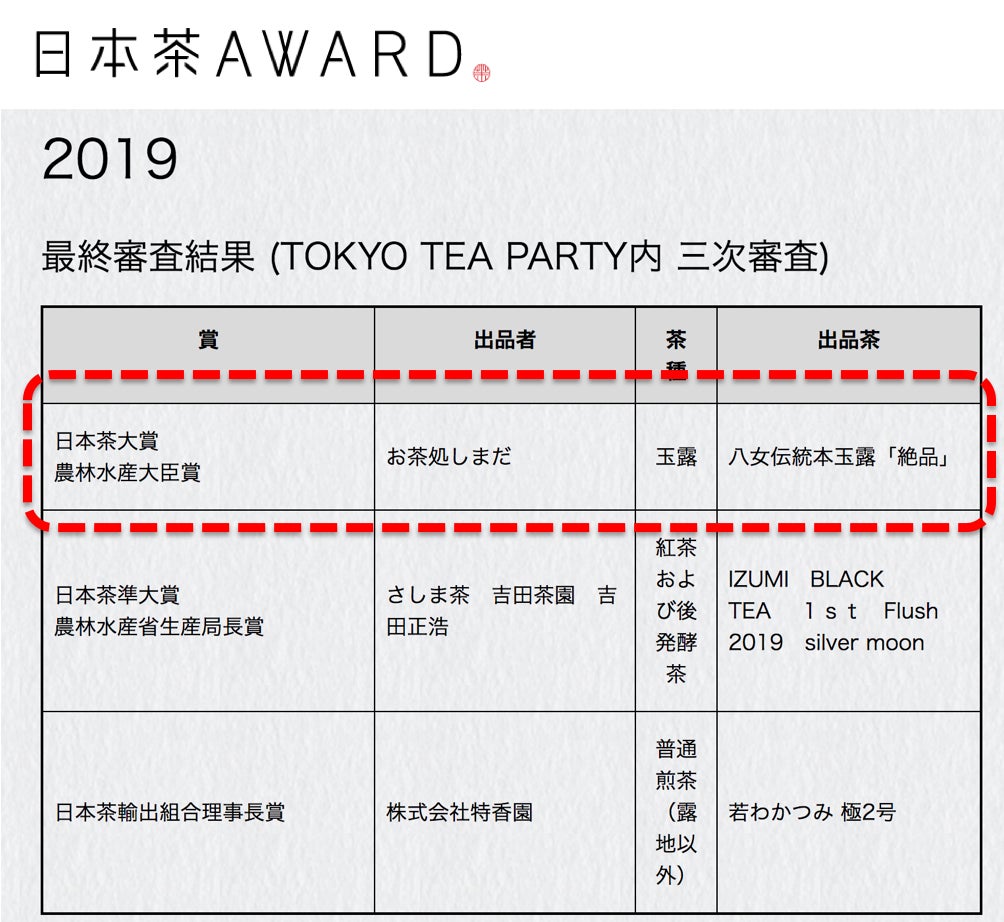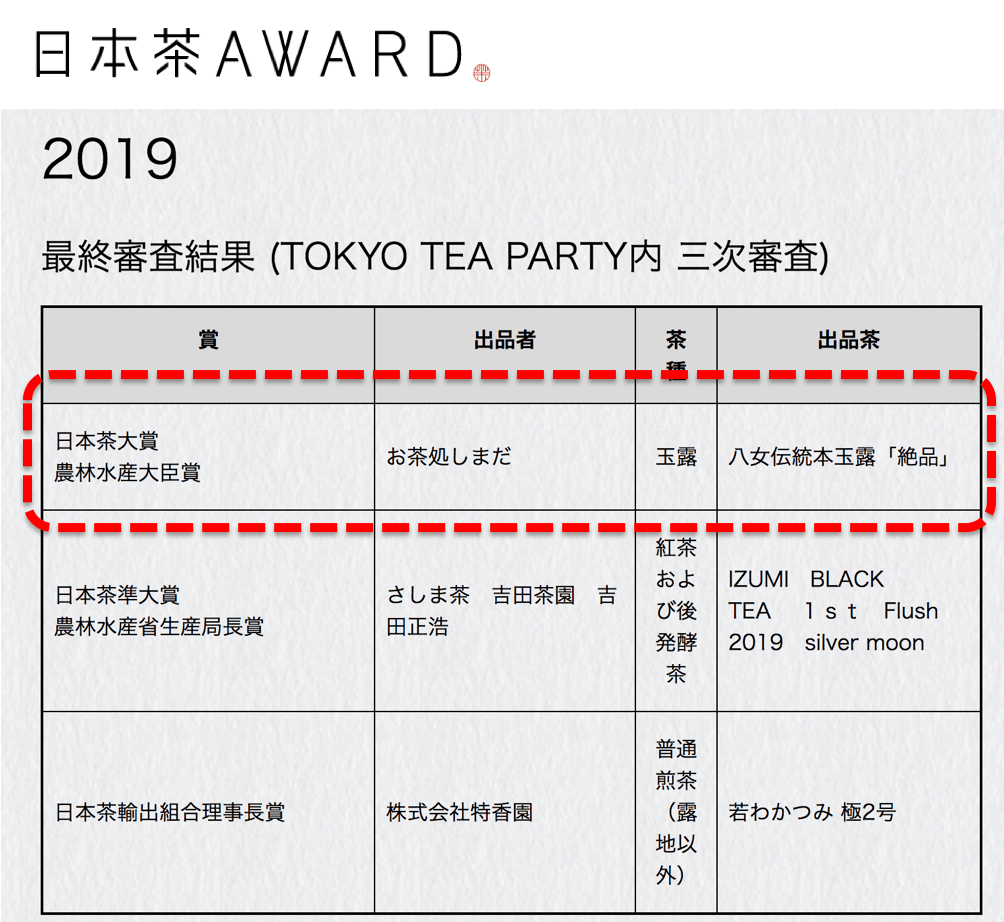 “1杯の日本茶~100年先の日本茶のためにできること~”をテーマに年に一度開催されている「日本茶AWARD」。この2019年度大会でも、長崎の「お茶処しまだ」さんが「八女伝統本玉露」で出品し見事「日本茶大賞」を受賞。審査に一般の方も加わる本コンテストでも認められたというのは、名実ともに最強の日本茶と言えると自負しています。