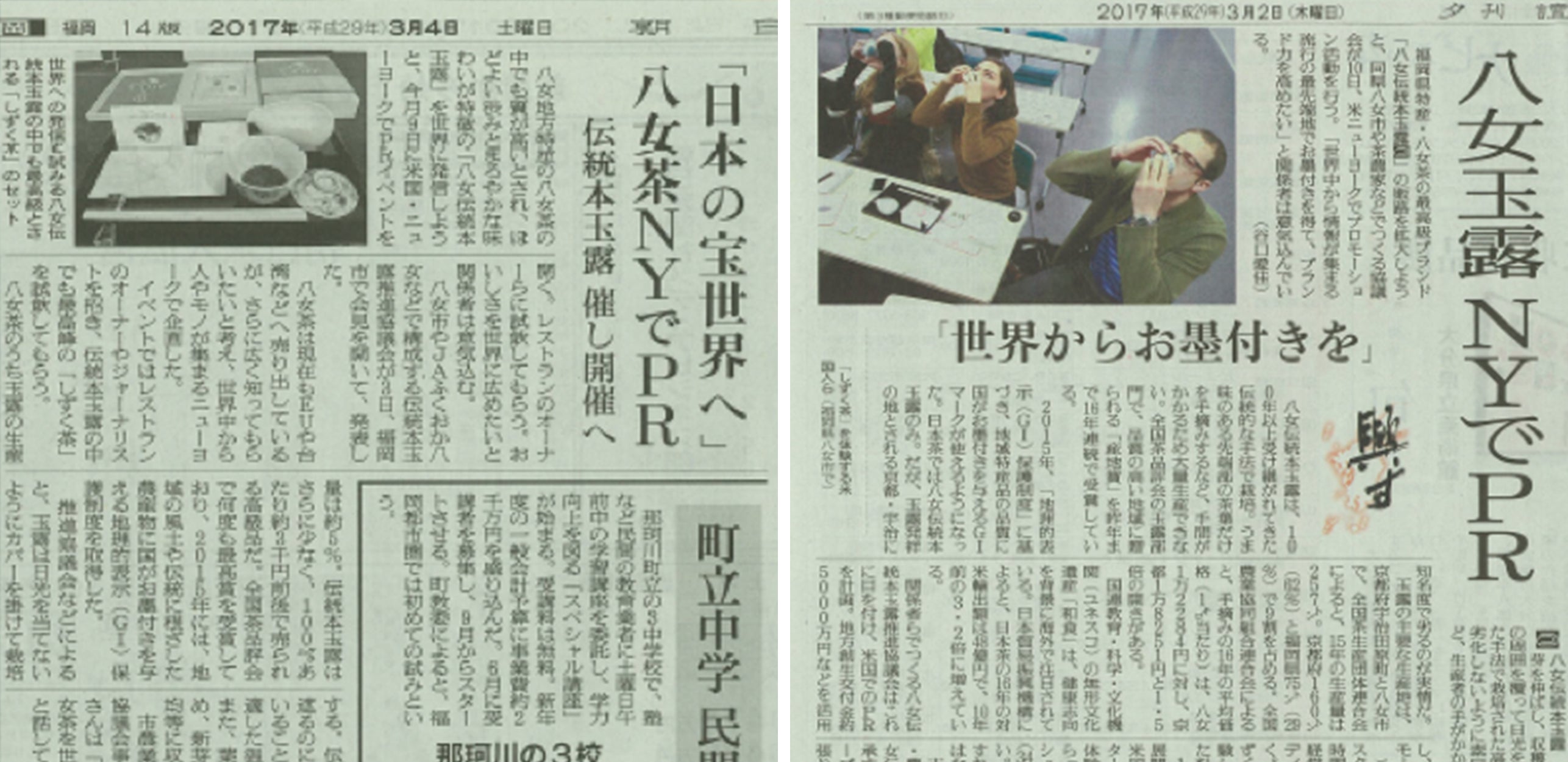 (八女茶世界進出を伝える新聞記事 左:朝日新聞 右:読売新聞)