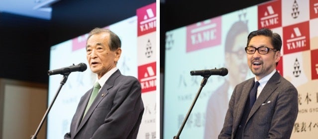 (2017年3月の記者会見 左:八女市 三田村市長 と ロゴマークのデザイナー:鈴木直之氏)