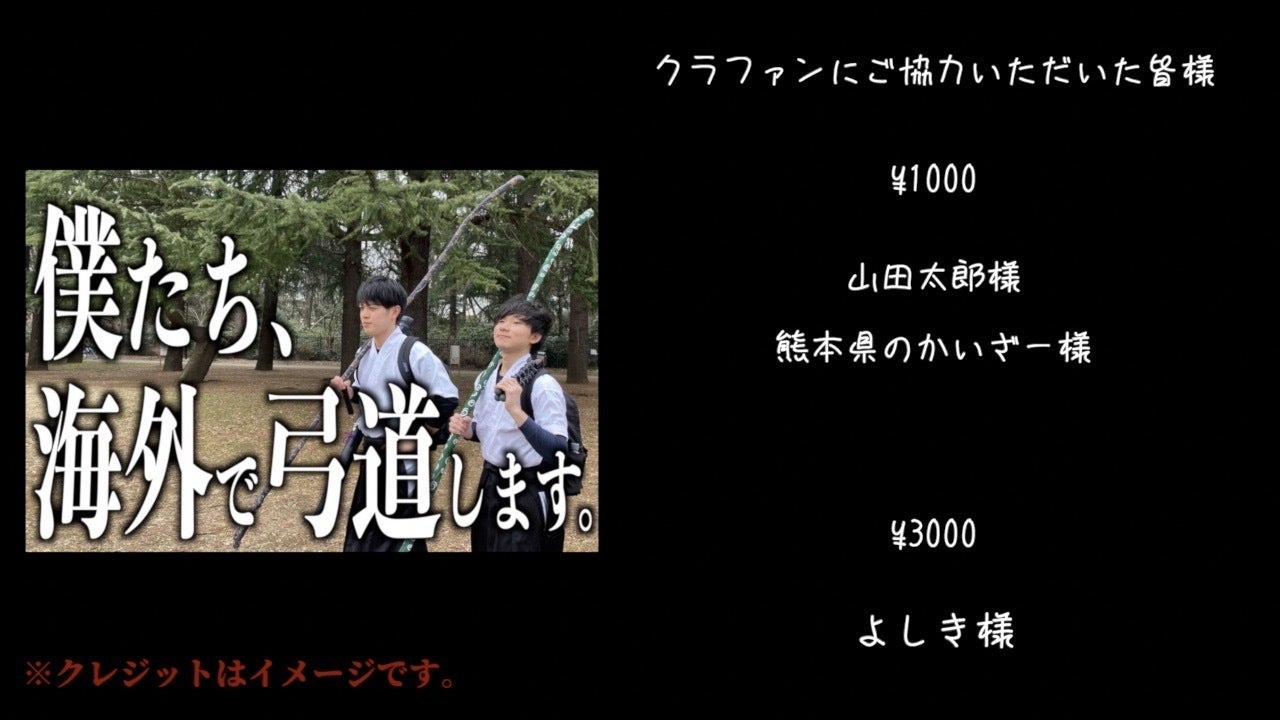 視聴者様、海外弓道の動画を観たい方、僕らと一緒に動画を作りたい方、リターンが気になる方、僕らと親交のある方、なんとなくこのページにアクセスした方、大変恐縮ではございますがご支援のほどよろしくお願い致します。最後までご覧いただきありがとうございました。