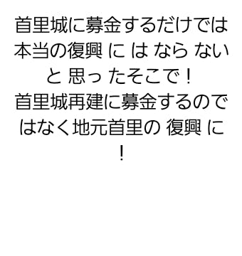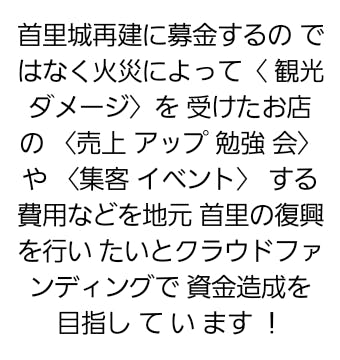 沖縄県全島の人に足を運んで欲しいと思ったので、今の首里城や火災を受ける前の首里城の絵や写真を小学生、中学生、高校生、大人で部門分けをして、展示 形式で首里城に掲載して投票してもらったり、まとめた写真集を作ったりしてみると売上の貢献、地元の方や沖縄県在住の方の来園のきっかけ作り、そして記録と記憶を忘れずに残しておくことをしたいと思います。