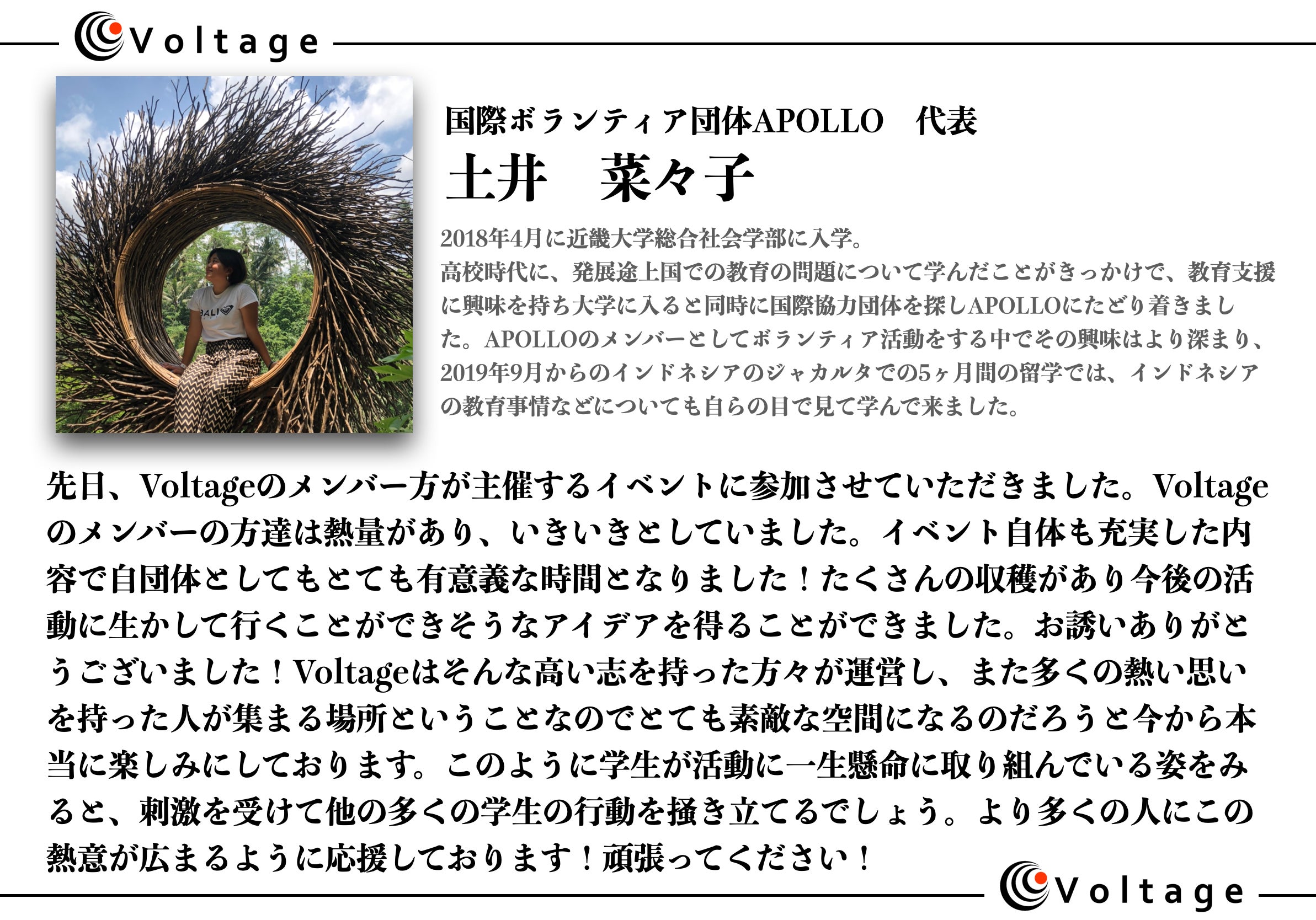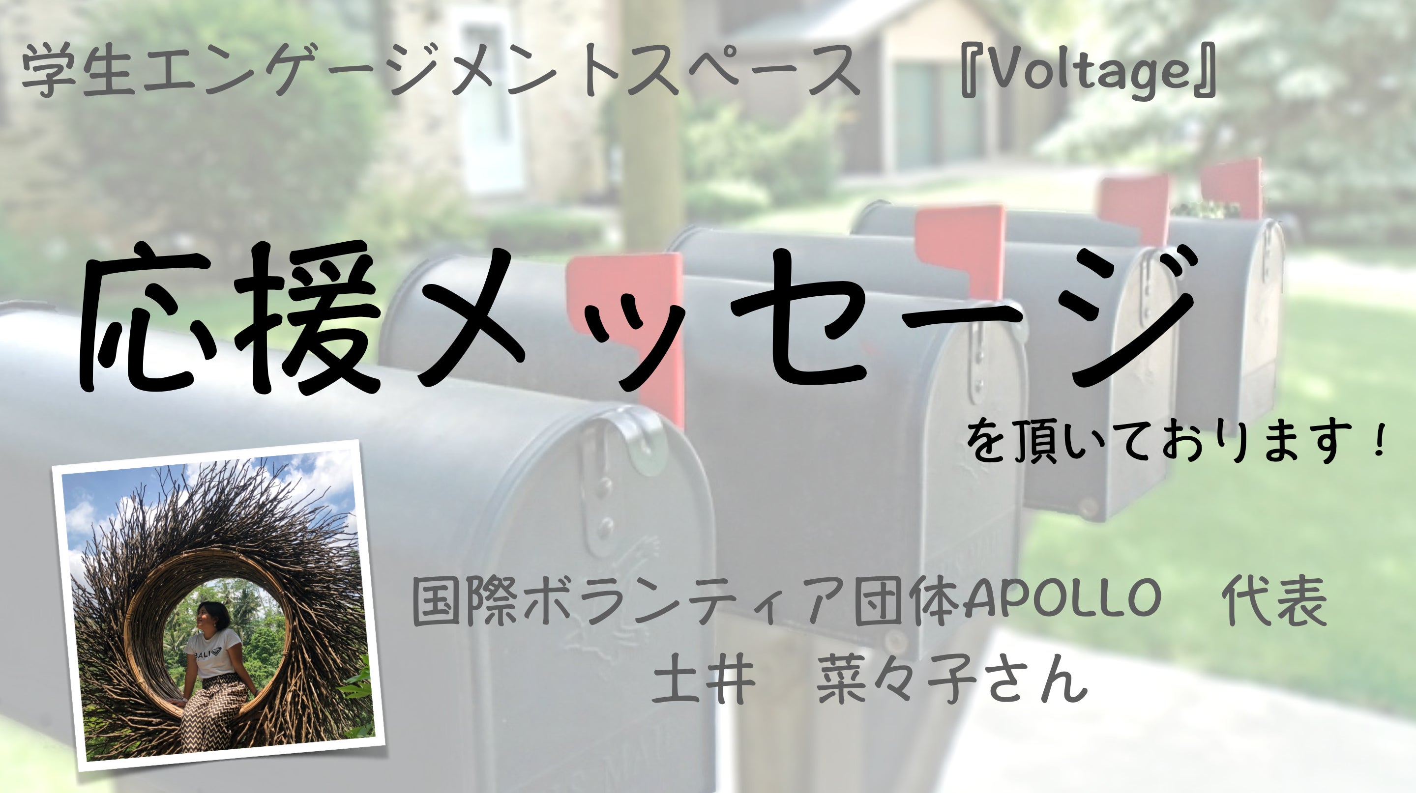 国際ボランティア団体APOLLO 代表 土井菜々子さんから応援メッセージを頂きました!