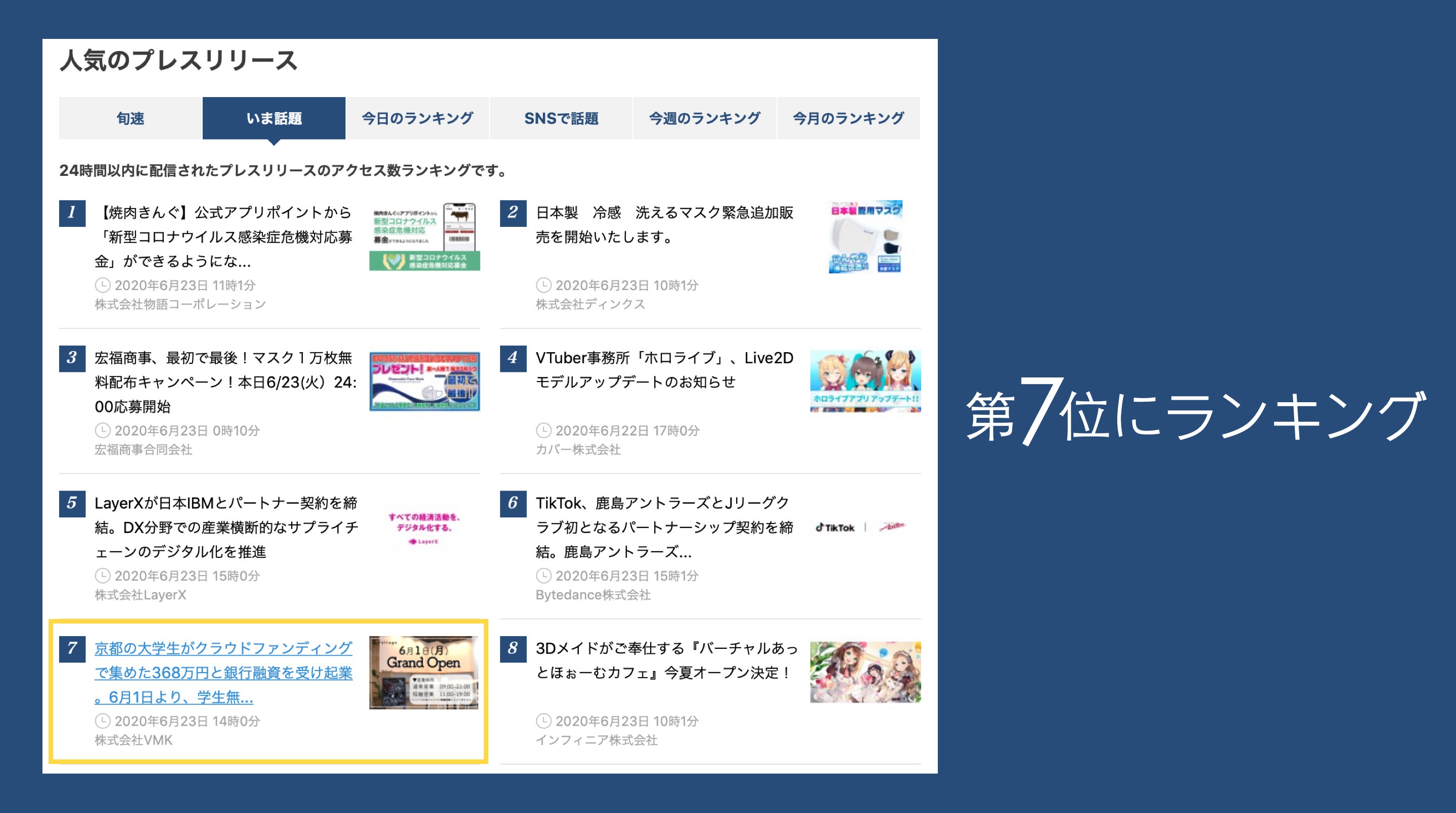 「いま話題<24時間以内に配信されたプレスリリースのアクセス数ランキング>」カテゴリー第7位(*2020年6月23日16時30分現在)にランクイン!