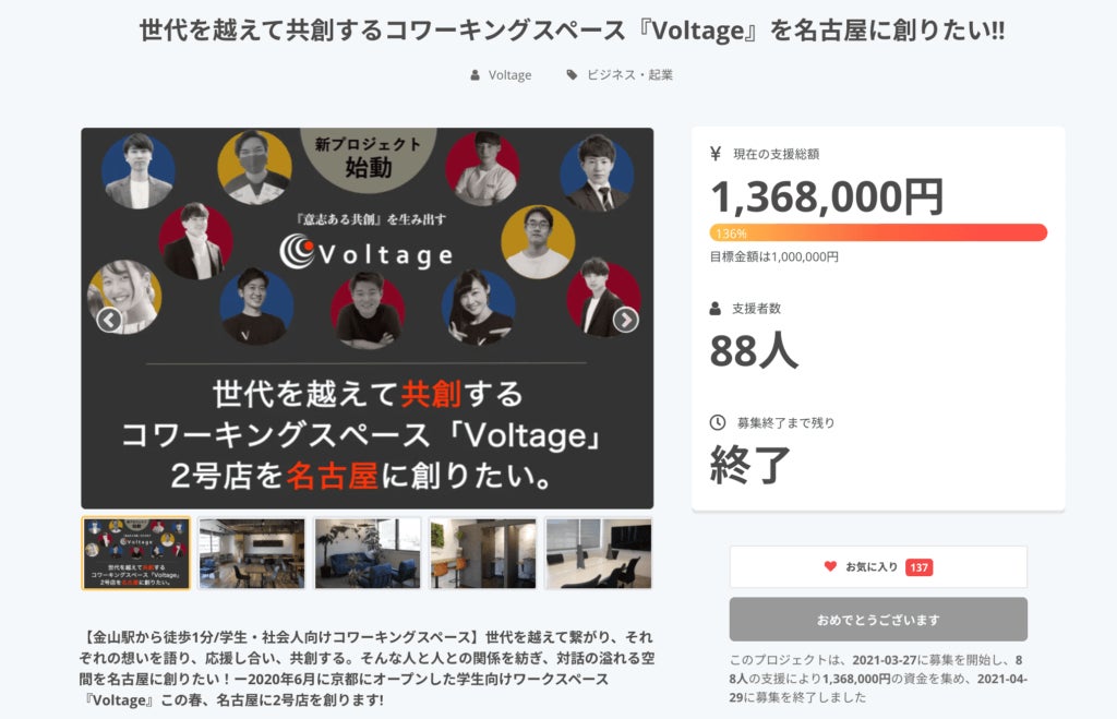 この夏、Voltage2号店を名古屋にOPNEするにあたり、クラウドファンディングを実施しました。多くの方々に支えられて、開始5日目にして目標金額として掲げていた100万円を達成することができました。