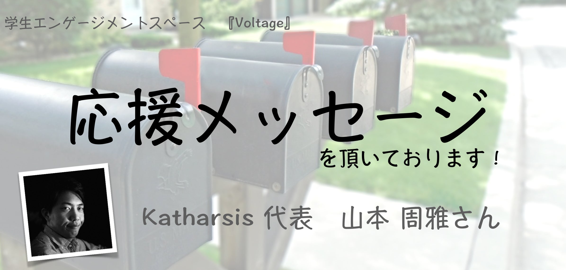 Katharsis代表山本周雅さんより、応援メッセージを頂きました!ー現役京大生が経営する 「語り×BAR Katharsis(カタルシス)」学生エンゲージメントスペース「Voltage」のミーティングをする際、たまに利用させて頂いております!若手のキャリア支援にも注力されているということで、以前、代表の田中と「何か共創できないだろうか」とお話しているようでした。「Katharsis」と「Voltage」との今後のコラボ企画に注目です!以下に、山本さんが代表と務める「Katharsis」についての情報を掲載しておきます。是非覗いてみてください!▼公式HPhttps://www.katharsis-official.com▼公式Twitterhttps://twitter.com/bar_katharsis▼公式Instagramhttps://www.instagram.com/bar_katharsis/?hl=ja応援メッセージをくださり、ありがとうございます!引き続き、応援よろしくお願いします!運営メンバー*本プロジェクトでは、学生エンゲージメントスペース「Voltage」に共感、応援してくださる方々からのメッセージを募集しております!▼下記メールアドレスより、応援メッセージをお待ちしております。お問い合わせ:voltage.kyoto@gmail.com