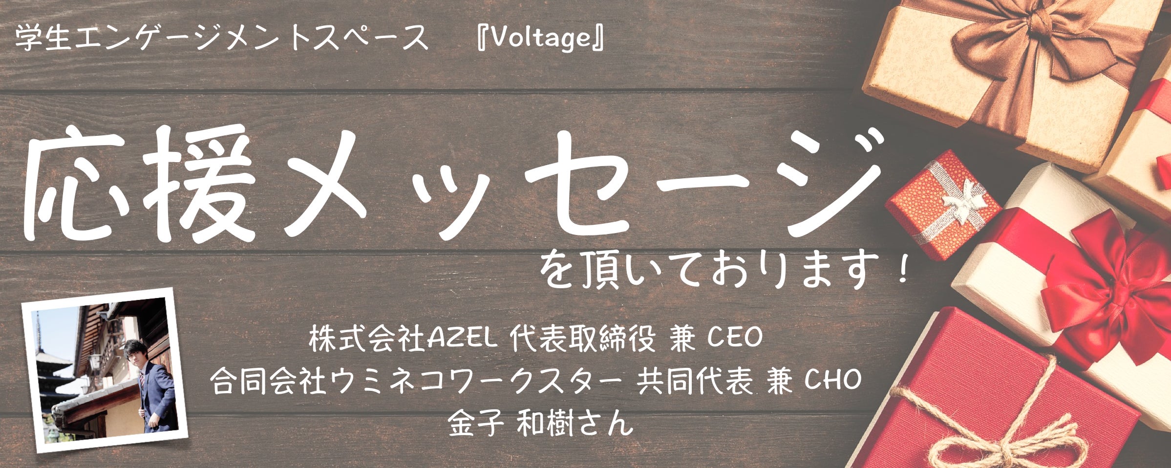 株式会社 AZEL代表取締役 兼 CEO 金子和樹さんより、応援メッセージを頂きました!金子さんとはTwitterを通じて出会い、初めて会ったにも関わらず、とても意気投合し、お互いのビジョンや想いを語り合ったのを覚えています。その後も、色んなアドバイスを頂けたり、一緒にイベントを作ったりなど、様々な形で良い関係としてお付き合いして頂いてます。同い年なのにこんなに社会で頑張っている人もいるのかと毎度刺激を受けております。これからはAZELに加え、合同会社ウミネコワークスを立ち上げ、WEB制作業界にも参入するということで、とてもワクワクしています。これからの活躍が楽しみです!互いに刺激しあえる良い関係で、共に成長していけたらと思います。今後ともよろしくお願いします!応援メッセージありがとうございました!*本プロジェクトでは、学生エンゲージメントスペース「Voltage」に共感、応援してくださる方々からのメッセージを募集しております!▼下記メールアドレスより、応援メッセージをお待ちしております。お問い合わせ:voltage.kyoto@gmail.com