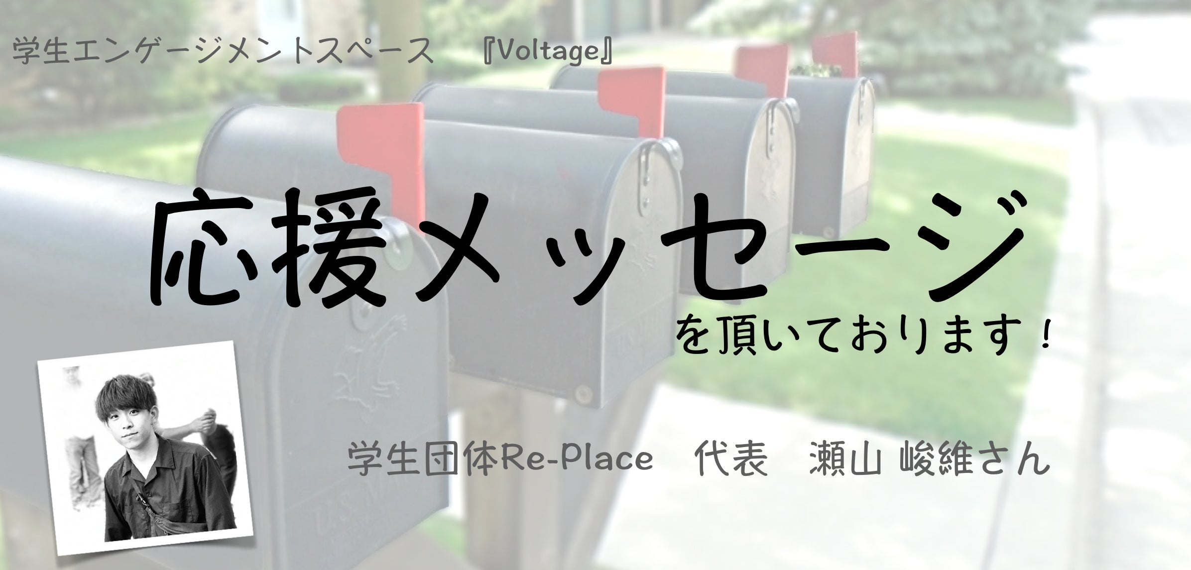 今回は学生団体Re-Placeにて瀧野皓太さんとともに共同代表を務めている瀬山峻維さんから応援メッセージを頂きました!繋がりづたいで知り合って、急に翌日、イベントに飛び入り参加して出会うっていう特殊な出会い方をしたのがとても印象的です。同じ志を持って自分たちが成し遂げたい目標のためにチャレンジしようとする姿に刺激をもらえますし、僕らも応援したいなと心から思ってます。これから関西盛り上げていけたらいいね!これかもよろしくお願いします!運営メンバー瀧野皓太と瀬山峻維さんが、代表と務める学生団体Re-Placeの公式Twitterはコチラです!▶︎@re_place0126是非是非、訪れてみてください♪また、以前瀧野皓太さんからいただいた応援メッセージもご一読ください!大変熱い想いの乗ったメッセージを頂きました!改めまして、お二方!応援メッセージをくださり、ありがとうございます!引き続き、応援よろしくお願いします!