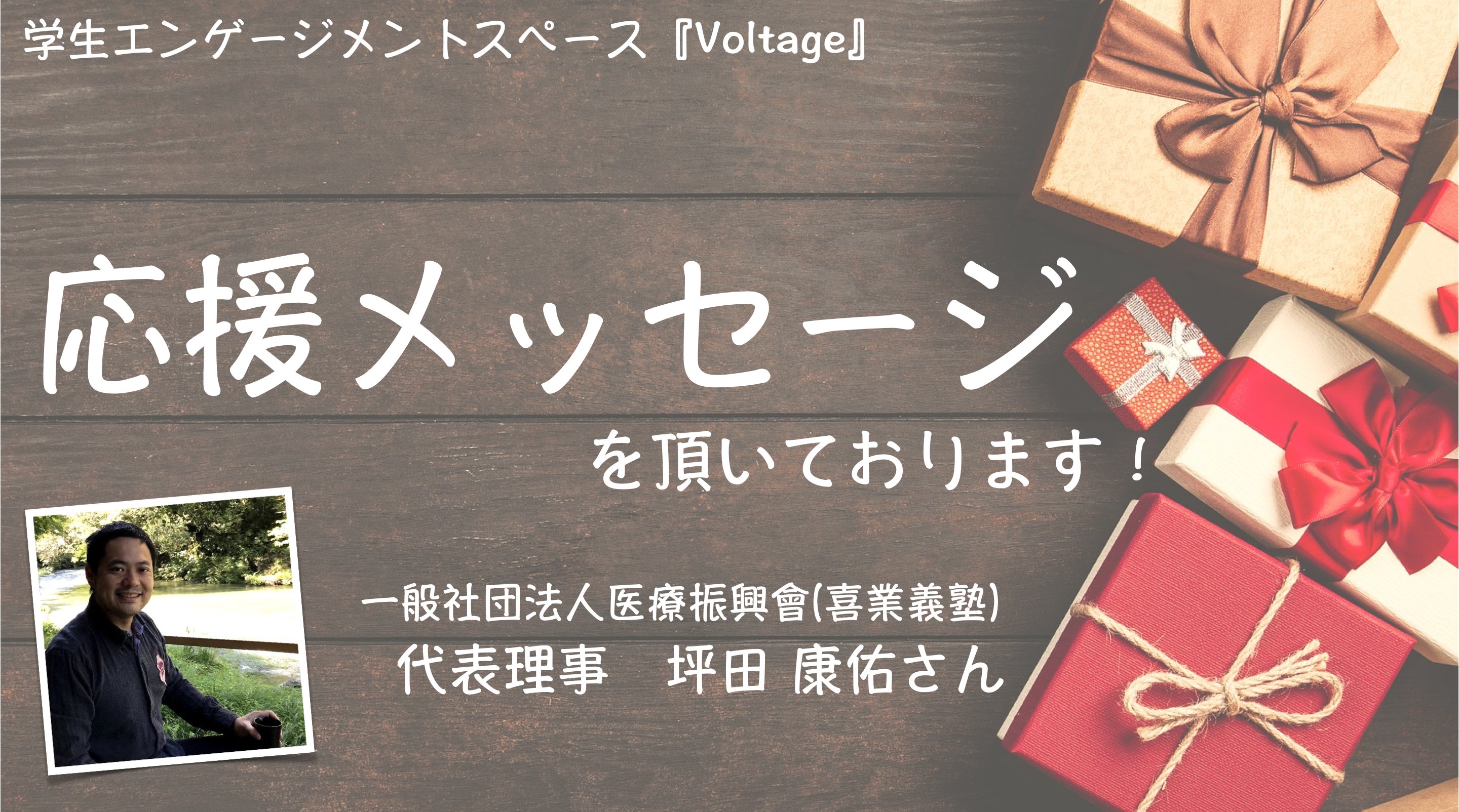 今回は、一般社団法人医療振興會(喜業義塾)代表理事 坪田 康佑さんより、応援メッセージをいただきました!坪田さん!!応援メッセージありがとうございます! 出会いはTwitterにて。 突然のDMにも関わらず、快く私たちの想いを聞いてくださいました! 坪田さんは、起業に対して強く熱い思いを持ってらっしゃる方です! これまでたくさんのプロジェクトの相談・支援・参画しており、学生時代にはオフィスを創って、起業を促していたとのこと!Voltageにも共感していただき、「何かコラボレーションできることはないか」とお話ししていただきました! また現在も複数の起業支援を行ったり、祇園でバーを経営したり、多岐にわたってアクティブに活躍されています! そんな坪田さんの想いも乗せて、京都をどんどん盛り上げていく活動をしていきます! この度は、メッセ―ジありがとうございました! 今後ともよろしくお願いします!運営メンバー