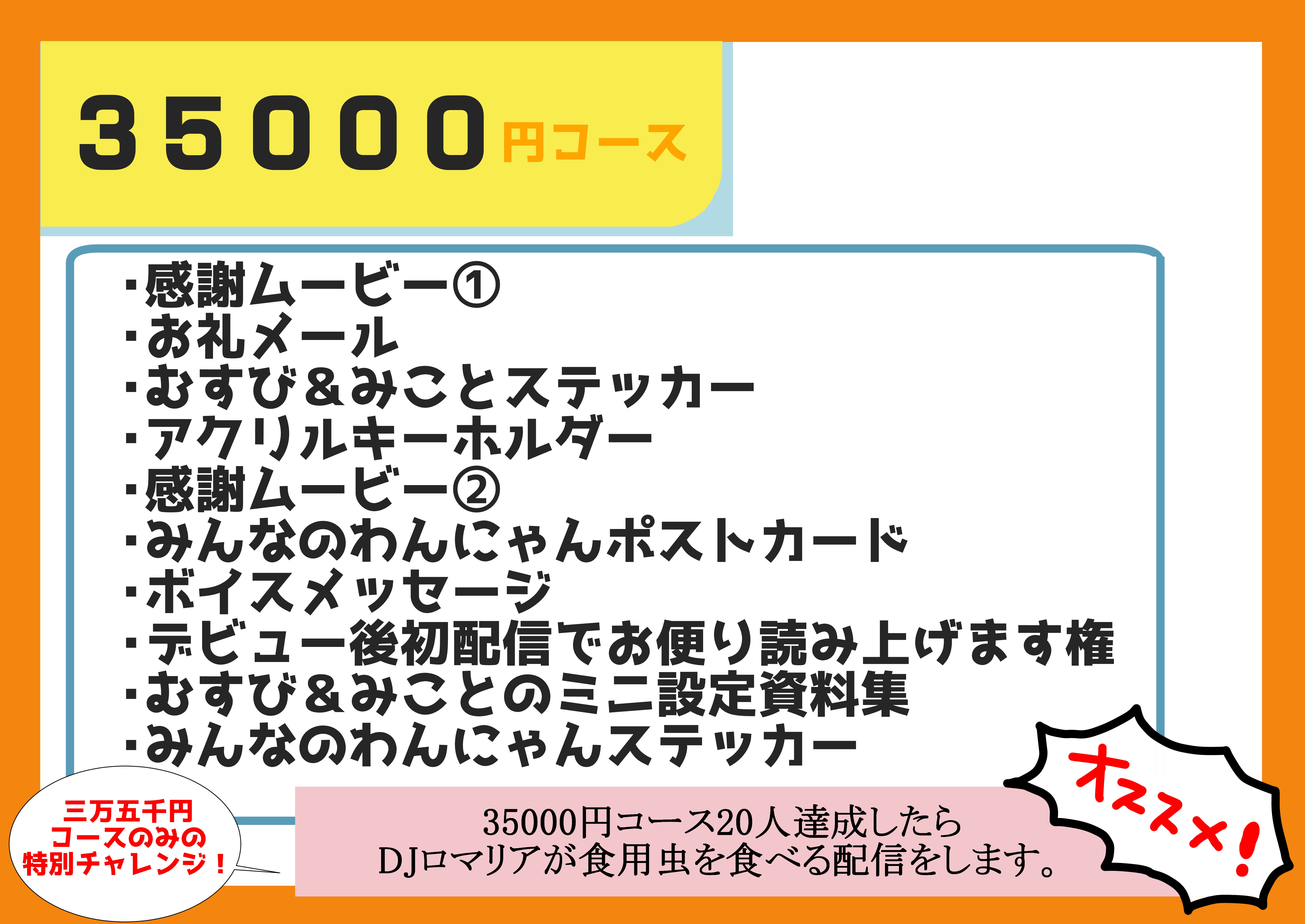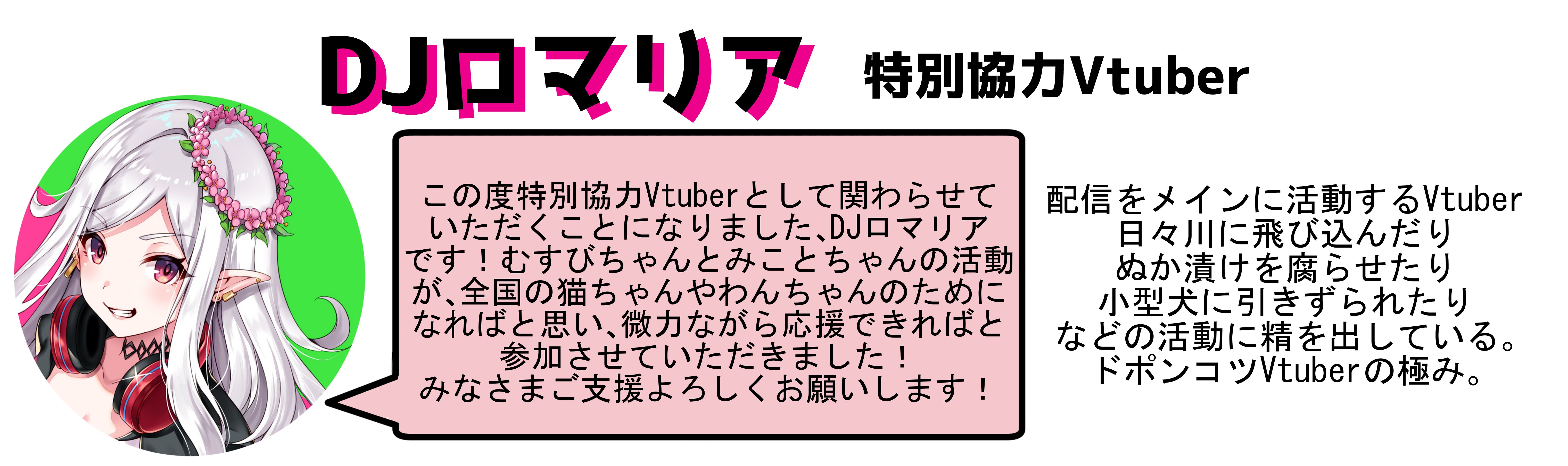 ◆特別チャレンジに関しましては、35000円コースの支援者様が20名を超えた場合のみ履行されます。DJロマリアとは当プロジェクトの特別協力Vtuberで、この世で一番嫌いなものは虫だそうです。