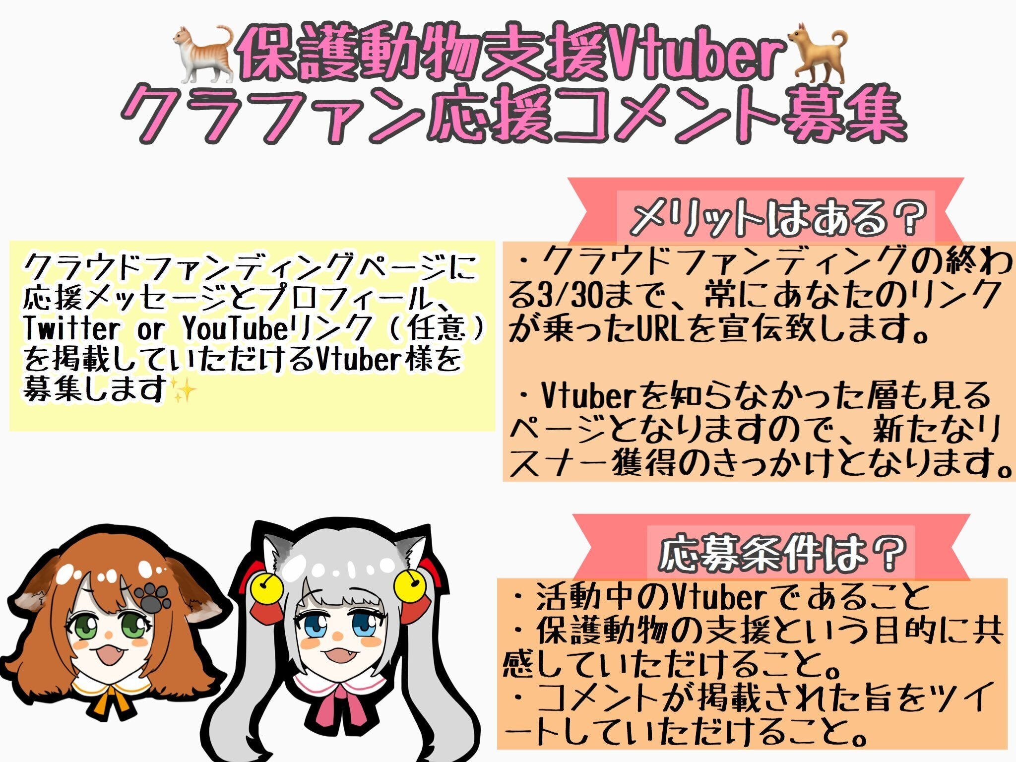 2020/02/08 16:40バーチャルの力で命を救う!『保護動物支援Vtuber』制作プロジェクトプロジェクトリーダーのヨルノです。2/7 21:30より、クラウドファンディングを開始させていただきました。皆様からさっそくのご支援をいただき、スタッフ・むすび&みことより心からお礼申し上げます!また、Twitterの方で今回のプロジェクトへ応援のメッセージを掲載させていただけるVtuber様の募集を開始いたしました。当プロジェクトからデビューする猫森むすび、猫森みことが保護動物活動を推進し、頑張っていくのは当然ですが、Vtuberという”文化”で救える命を増やしたいという想いから、できるだけ多くのVtuber様に関わっていただきたいと考え募集を開始させていただきました。本日のお昼から募集を始めたにも関わらず、すでにたくさんのお声をいただき、本当にありがたい限りです。まだまだプロジェクトは始まったばかりで、これからむすび&みことのプロモーションが始まったりと成功に向け色々な企画を考えております。スタッフ一同改めて気を引き締めてまいりますので、是非応援の程よろしくお願いいたします!ヨルノナカ もっと見る