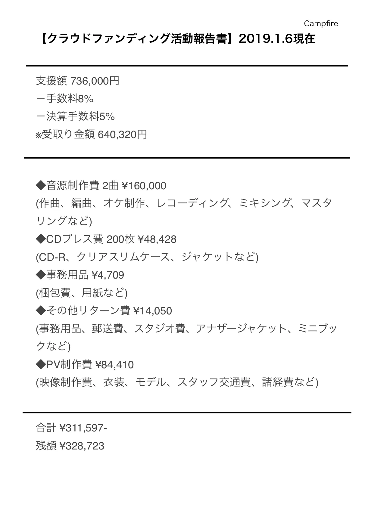 2019/01/06 19:21こんにちわ!なるせまこです!先日ご案内したMVが2019.1.1より公開されました!皆さん見ていただけましたでしょうか??☺まだの方はこちらから見れます!是非チェックお願いします!https://youtu.be/lST5Y3UHyxIそして、1/6現在のクラウドファンディング収支報告書を更新します!ご支援していただいたお金は大切に使わせていただいております。3/23にはミニアルバムを発売予定です!そちらも楽しみにしていてくださいっ!なるせまこ もっと見る
