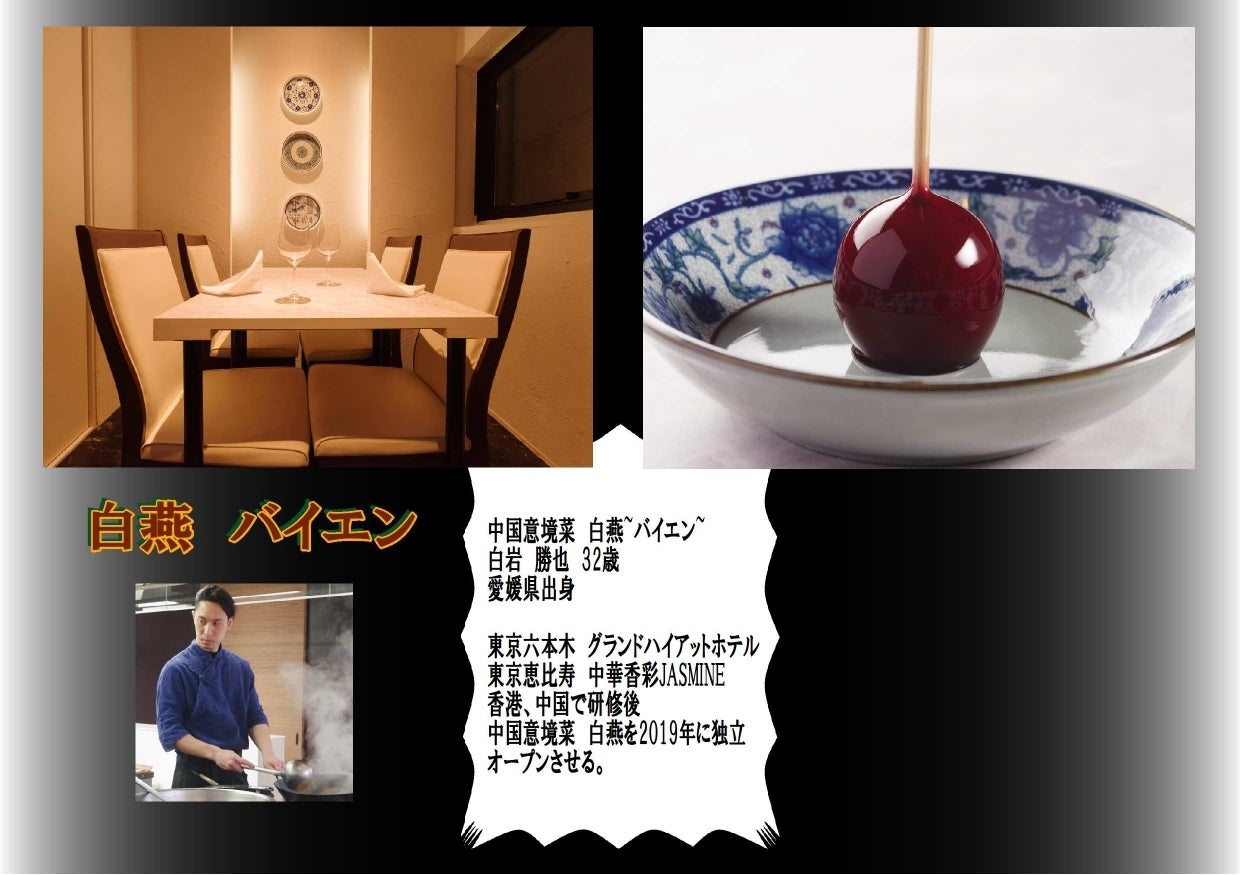 バイエンの名物リンゴアメから始まりシェフが今まで感じて来た本場の中国料理をお楽しみ下さい。