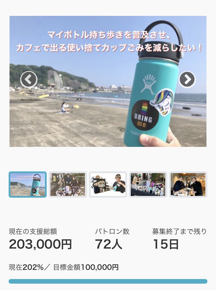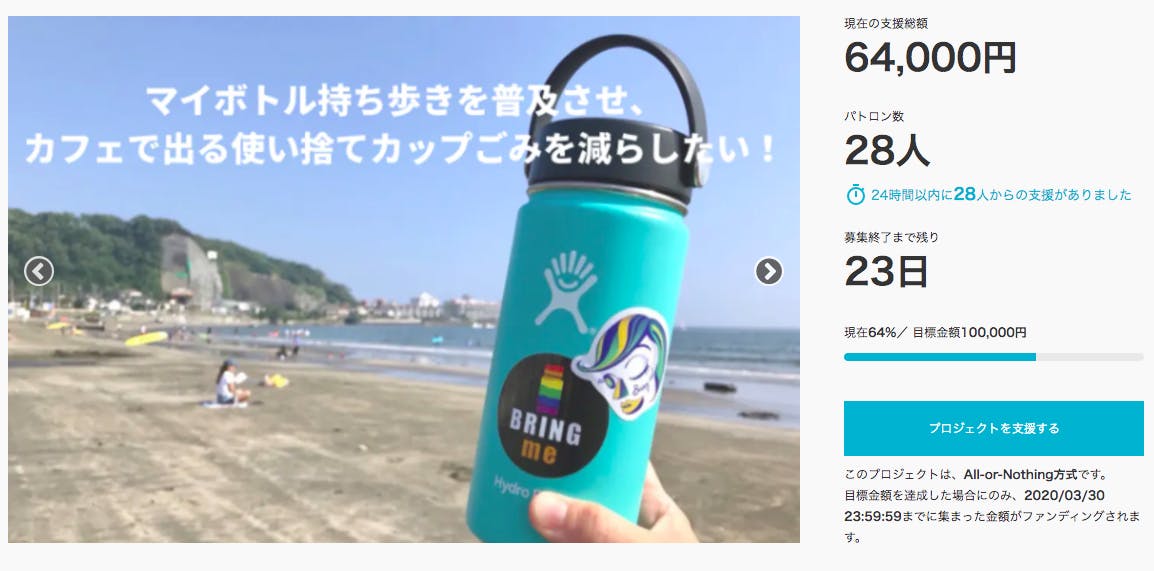 2020/03/10 16:05こんにちは!Bring me ShonanのPRを担当しているRomyです。クラファンを3月7日(土)に公開し、翌日の夕方に目標金額の10万円を達成しました!本当にたくさんのご支援ありがとうございます!さて、今回のプロジェクトの募集終了が3月30日なので、残り21日あるのですが……ネクストゴールとして20万円を目指します!今回のクラファンの主目的が、Bring me Shonanの賛同店舗にステッカーを無料配布したい。そして来店したお客様に配布していただき、「マイボトルを持参して使い捨てカップごみを減らそう!」というメッセージを拡散していきたい!なのですが……実は目標金額の10万円だと、もうすぐ50店を迎える全店舗に配布できるのがおそらく30枚ほどなのです。それを100枚に増やしたい!!そのためにも、ぜひ引き続きたくさんのご支援・ご協力をお願いします!また、リターンも増やそうと思っているので、決まり次第追加します。「こんなのがほしい!」「こんなことしてほしい!」といったアイディアがある方は、ぜひ教えてください!ちなみに3月10日現在、これくらい集まっています ↓↓↓ もっと見る