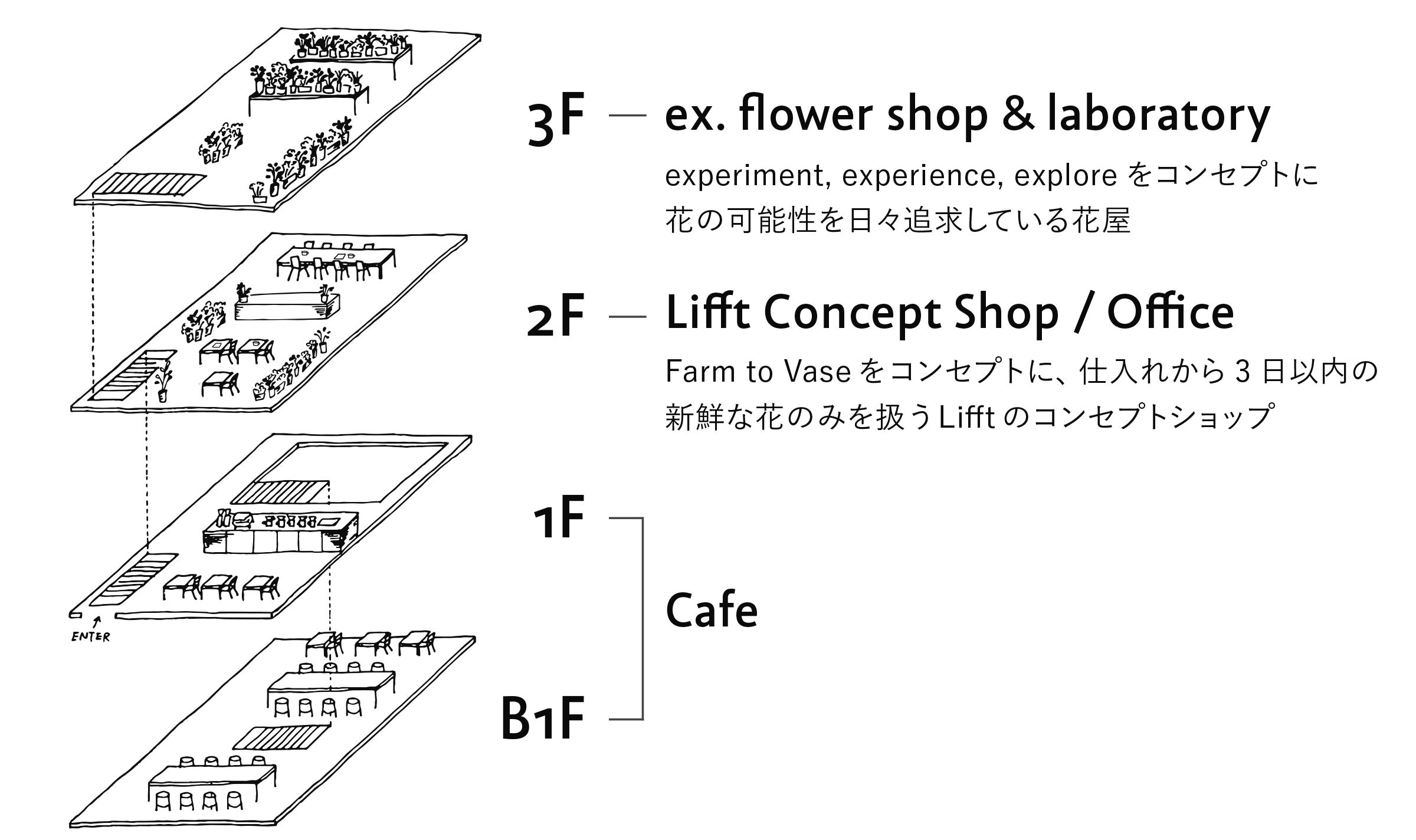 2020年2月、ご縁があってBOTANICの本社は、ブルーボトルコーヒー 中目黒カフェの2F、3Fへ移転しました!6年前に中目黒で始めたex. flower shop & laboratoryは3Fへ。2Fには、花き業界をアップデートするような新しい企画を生み出すBOTANICオフィスと、Lifftの活動を発信し、魅力を体験できるショールーム
