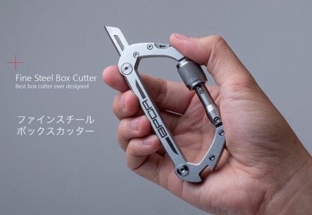 GPカラビナには、コンパクトな2mm厚のカッターナイフが備わっています。