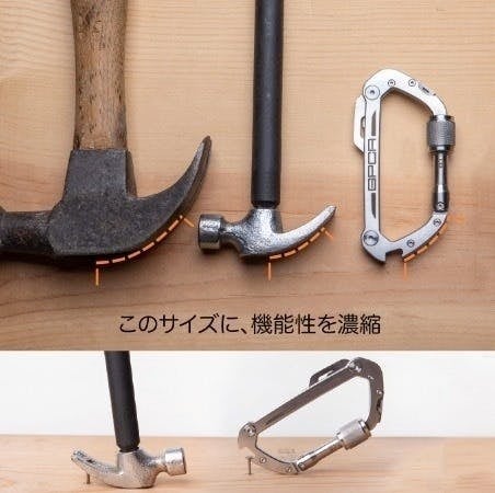 通常の小型バールやフルサイズの金づちと比較すると、GPカラビナに施されたフックの形状に意味があることがわかるはず。