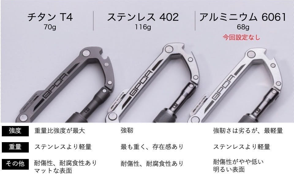 素材:本体、ナイフ、カラビナゲート、ロック、ドライバ等:チタン(T4)