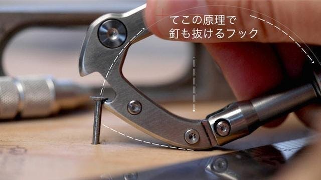 GPカラビナにはフックがインストールされていて、バールとして使ったり、釘を抜いたりするのに重宝します。