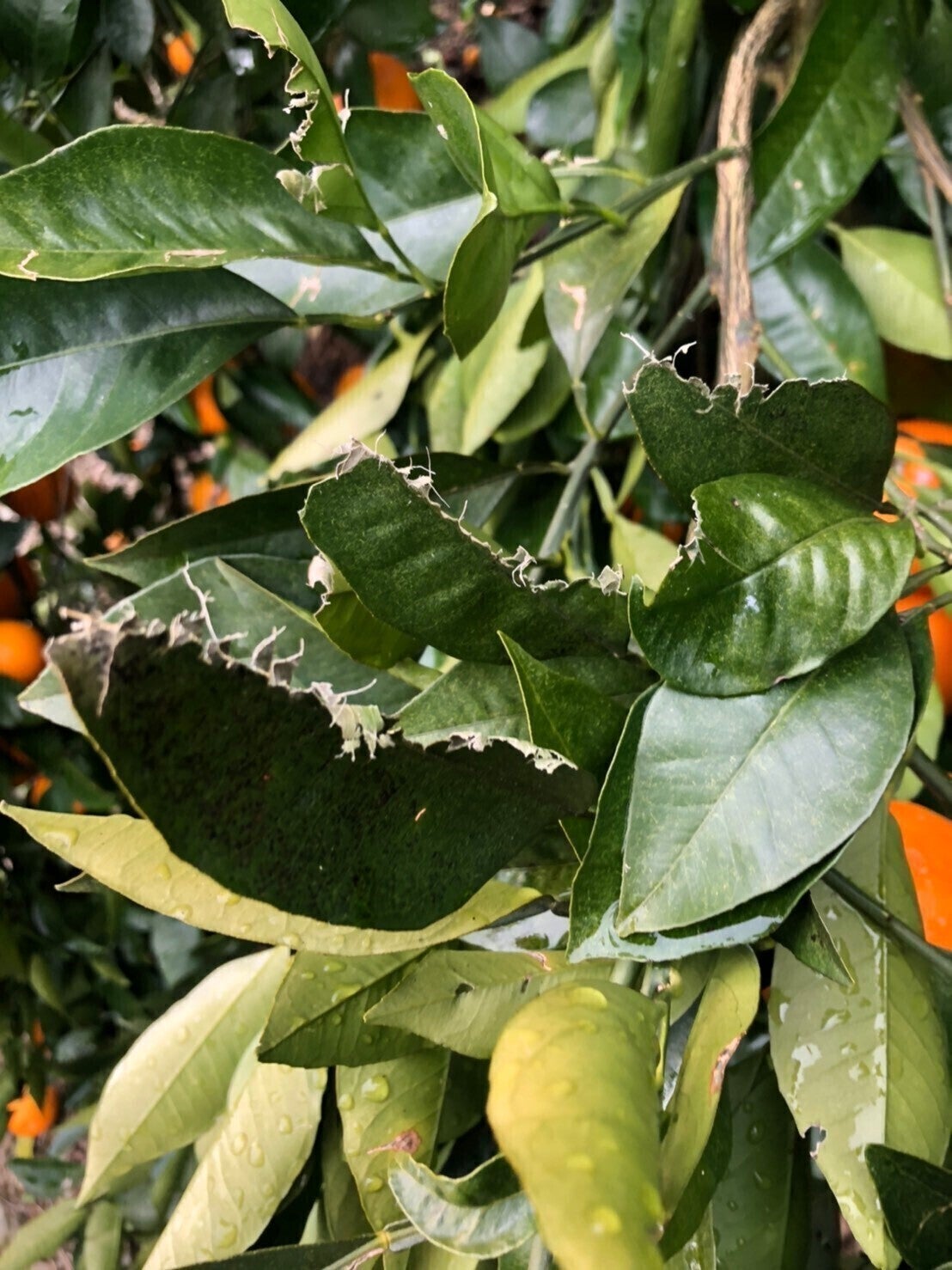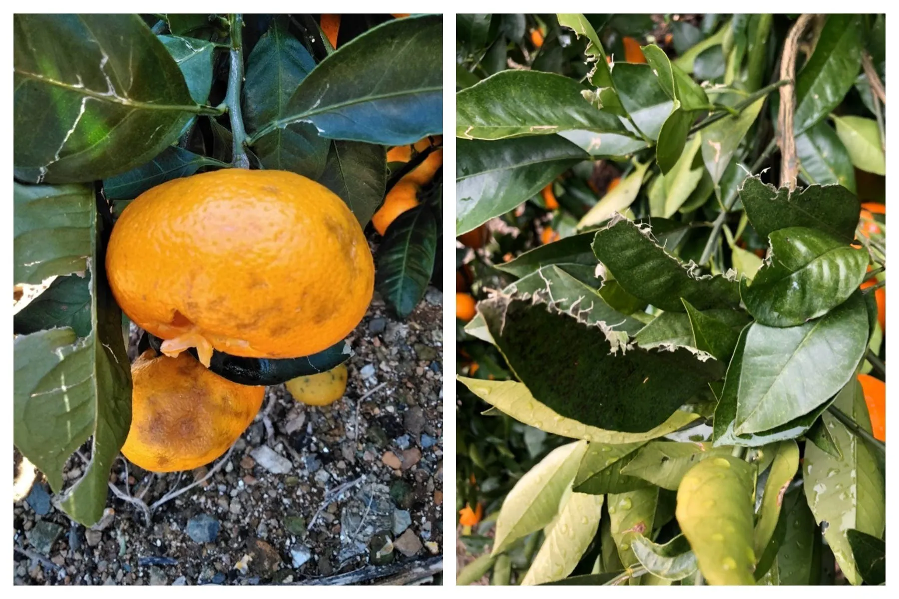 約1~2㎝ほどの大きさのひょうにより、果実は打撲、葉っぱは貫通してボロボロになってしまいました。