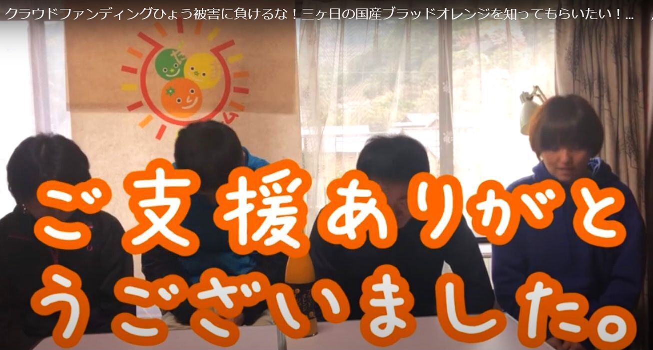 2020/04/20 08:43この度3月27日をもちまして、今回のプロジェクト「ひょう被害に負けるな!三ヶ日の国産ブラッドオレンジを知ってもらいたい!」は終了いたしました。皆様のおかげで最終的な支援額は186,000円となり、当初目標に対し約40%の達成率となりましたことを厚く感謝申し上げます。陽だまりファームは、皆様からのご支援を糧に、三ヶ日の国産ブラッドオレンジをより多くの方に知っていただき、味わっていただけるよう邁進して参ります。また、常に新しい情報をお届けできるように、弊社HPやブログ、各種SNSなどを活用して情報配信していきたいと思います。今後とも何卒よろしくお願いいたします。 もっと見る