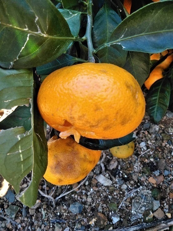 みかんをはじめ、多くの農産物が被害を受けました。ブラッドオレンジも例外ではなく、雹(ひょう)にあたってしまった実は生で市場には出せず、処分するしか道はありませんでした。
