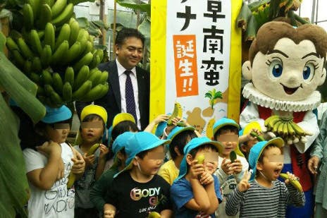 (バナナと上天草市長と園児)天草での無農薬で美味しい日本産のバナナ栽培には成功しましたが、以後、堀江市長から期待されたバナナでの地域起こしの方策を研究してきました。