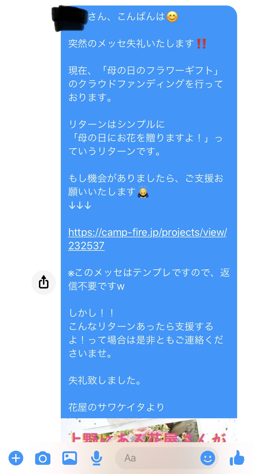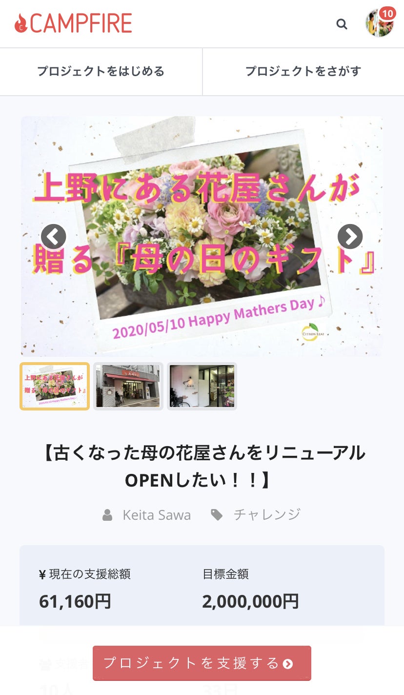 クラウドファンディグ開始から1週間が経ちました。達成率は5%です。まだまだ遠いです。自分でもかなり甘い考えだったと思っております。「母の日になればお花を贈るだろうから直ぐに支援が集まるだろう」としかし全然集めることが出来ていません。ただ諦めません。最後まで自分が出来ることをこなして言って色々とチャレンジしていきたいと思います。いまやるのは日々コツコツと一人一人に営業していくのみ。花屋のサワケイタ