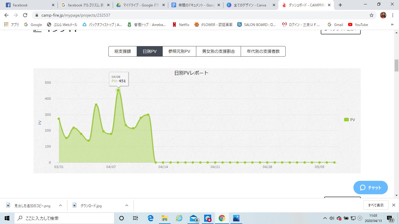 クラウドファンディング終了まで残り25日です。現在目標金額には到達していませんが、沢山の人たちにご支援していただいたことを感謝です!!ここでクラウドファンディングの途中経過のご報告をしたいと思います。まずはPV数です。基本的に私が行っていることが・直接メッセする。・Facebook、インスタ、Twitterで発信する↑これらのことを行っているので以下のようなPV数になっているのかと思います。男女比率についてここは私のSNSで繋がっている人々も同じくらいの比率なので特に変わった部分がないと思っております。最後に年代別の支援者についてここは「やっぱりとか、なるほどな」と言った印象です。圧倒的に30、40代の支援者の方が多いという感じです。SNSで繋がっているのがその世代の人が多いというのもありますが、10代の人に関しては「0」※何人かにはアプローチしてるがこの結果50代に関しては贈る可能性は大いにありそうですがそもそも繋がりが少ないというのが私の見解です。まあよく考えたら、自分が10代の時に「母に花を贈るか?」って考えたら贈らないよね。って思いました。