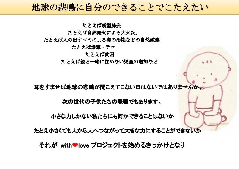 with ❤loveグッズが多くの人に支援していただき、世界に『愛・信頼・希望』の灯をともす小さな力になりえることを願って、このプロジェクトをスタートします。