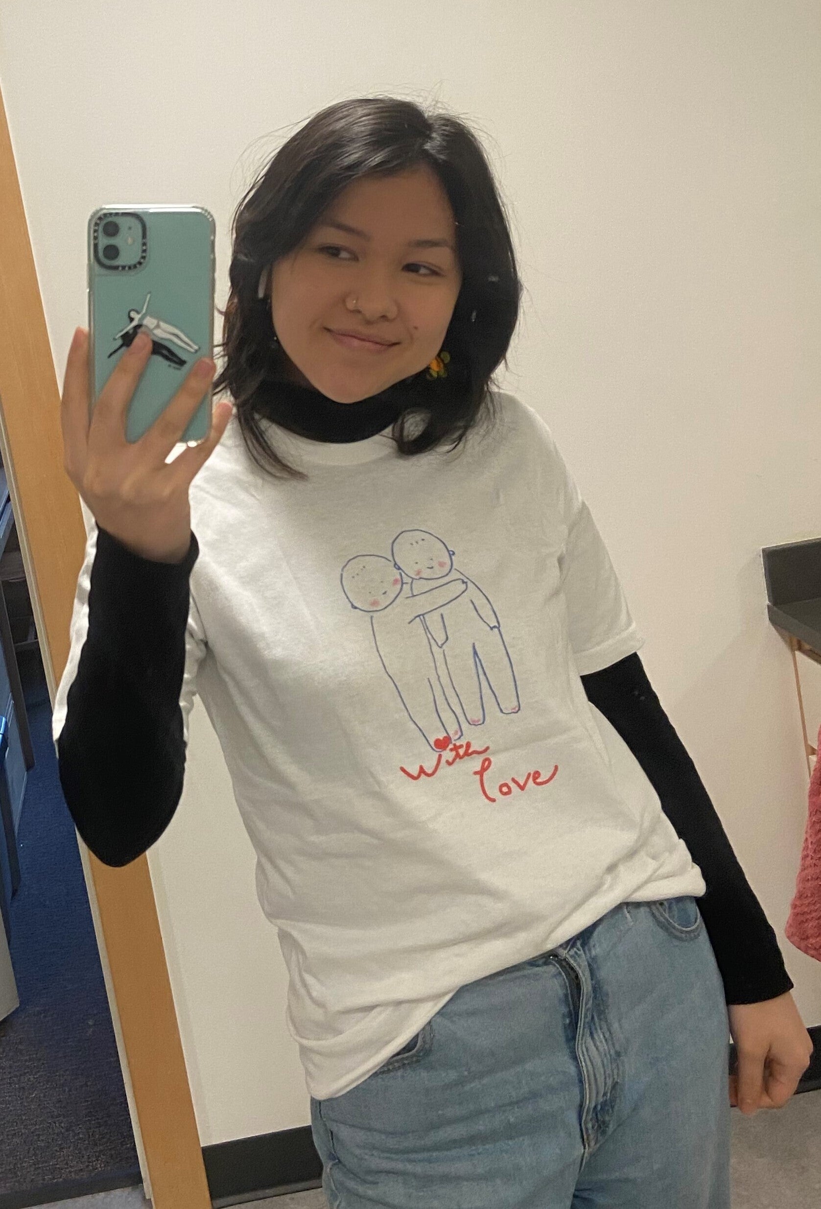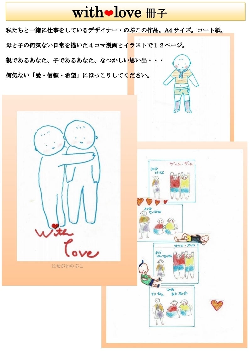 母親が母と子の何気ない日常を愛をこめて(with love)描いたイラストがあります。その一つがこれ。このイラストを使ってTシャツ、バッグや小冊子などのグッズを作り続けクラウドファンディングで人から人へ広めていくことにしました。